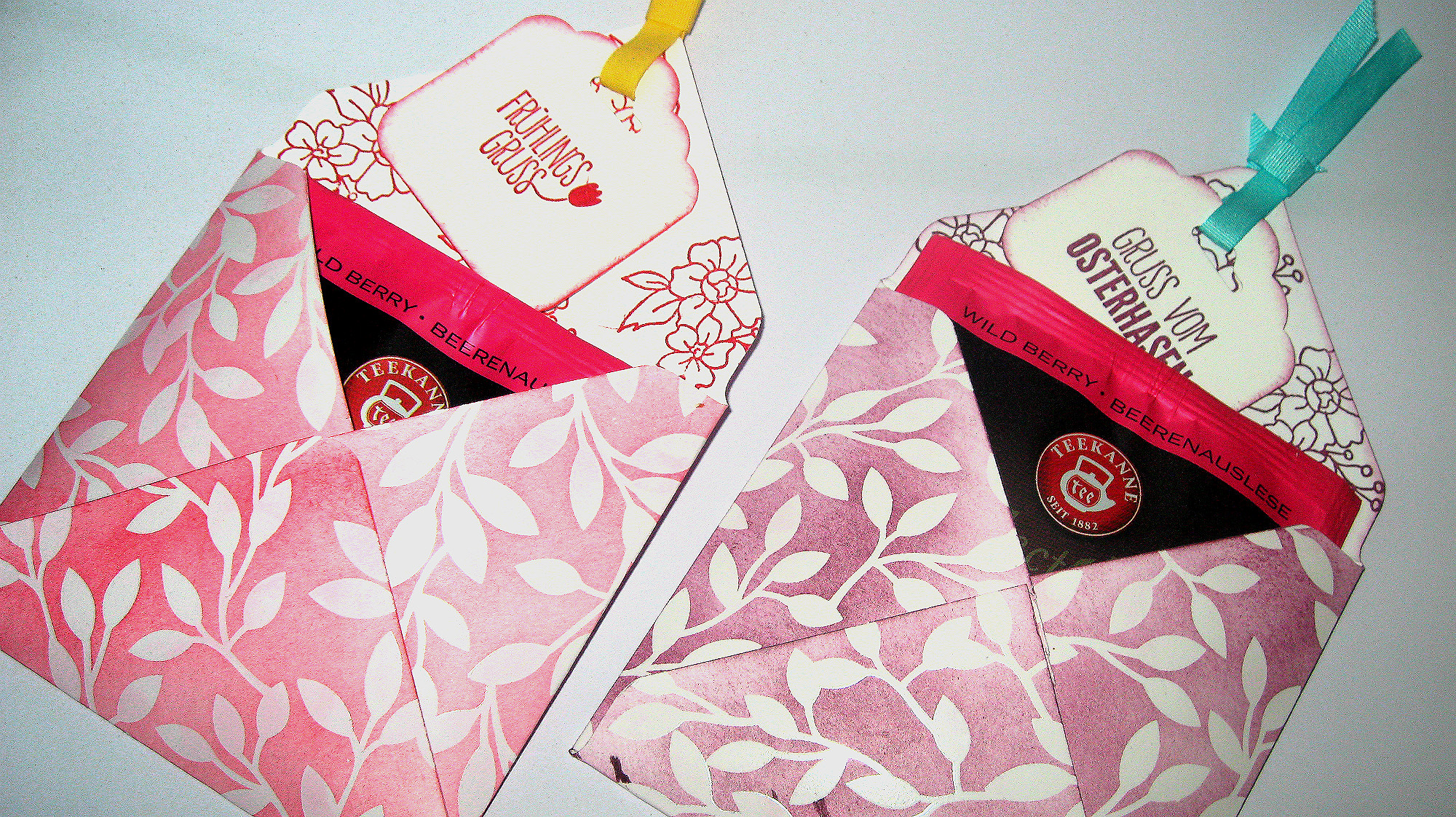 Ich habe hier mit dem Envelope Punch Board gearbeitet und bei 3 “ (oder 7,6 cm) gestanzt und gefalzt. Beim linken habe ich die Ecken noch mit dem integrierten Eckenabrunder abgerundet und dann drei der vier Ecken mit Mini-Gluedots angeklebt. Das Papier ist aus der Sale-A-Bration Aktion und nennt sich Besonderes Designerpapier Zauberhaft, welches ich mittels Schwammtechnik einmal in Glutrot und einmal in Himbeerrot eingefärbt habe.