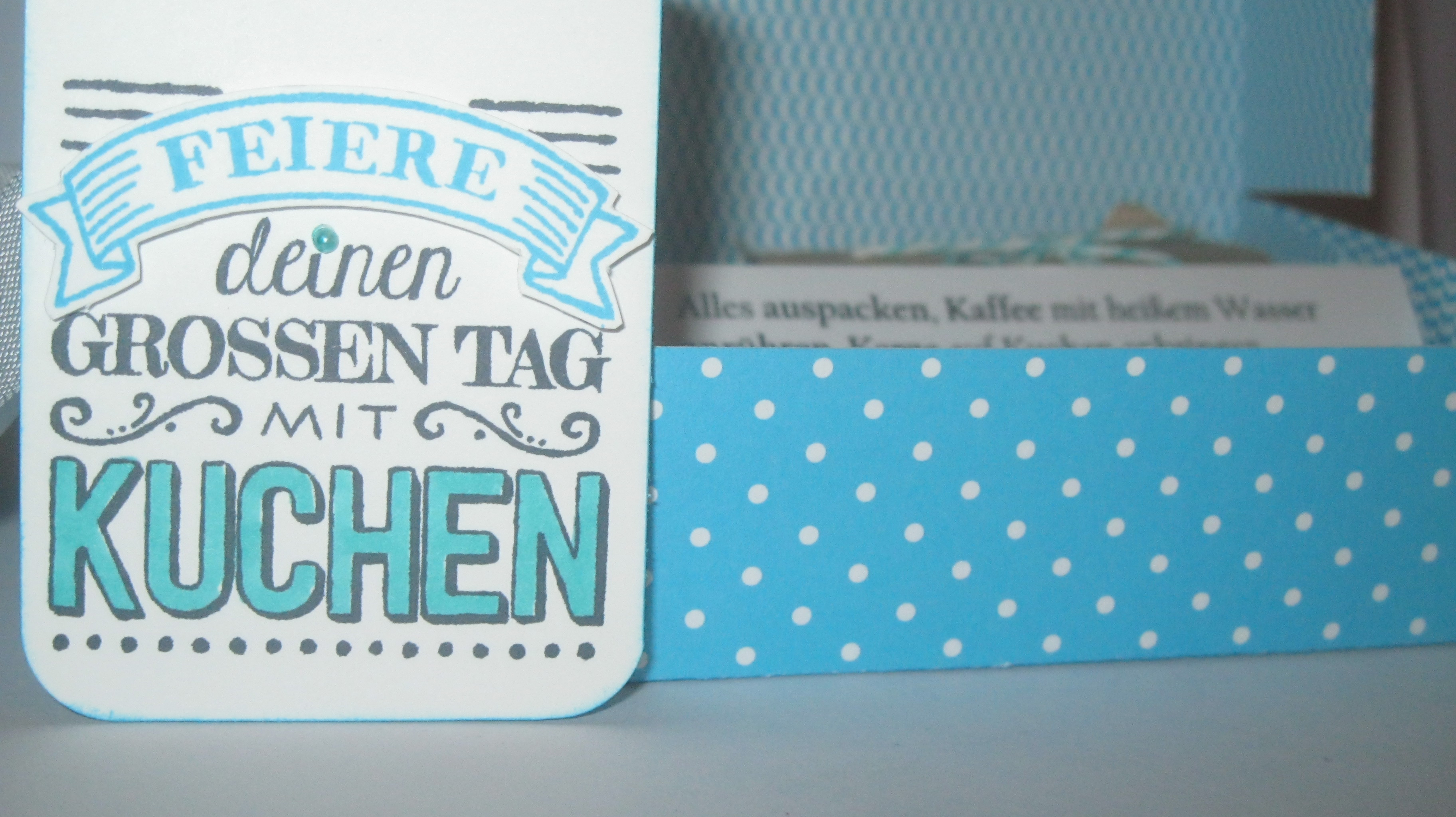 Als Papier habe ich die Polkadots aus dem Designpapier im Block in der Farbe Bermudablau gewählt und der Stempel stammt aus dem Set „Zum grossen Tag“ aus der aktuellen Sale-A-Bration von Stampin Up. Der Standardstempel wurde mit einer kleinen Perle dekoriert, die ich mit dem Mix-Marker in Jade angemalt habe, welchen ich auch für den Schriftzug „Kuchen“ verwendet habe. Verschlossen wird dieses Geschenk mit dem Saumband in Flüsterweiß.