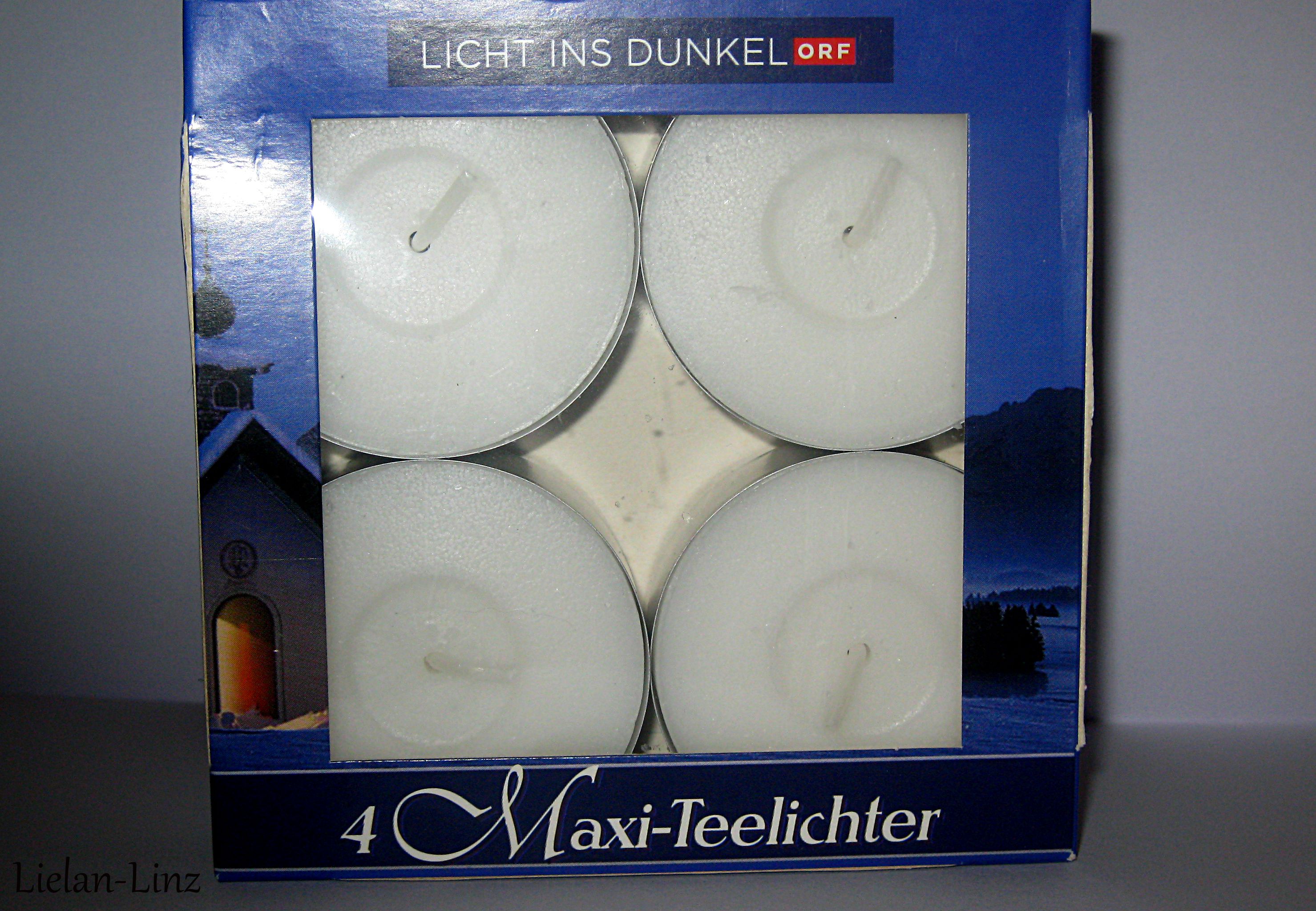 Dieses Mal habe ich, ziemlich versteckt, bei meinem Supermarkt um die Ecke, diese Maxi-Teelichter gefunden, die man normalerweise in der Vorweihnachtszeit im Kassenbereich findet.