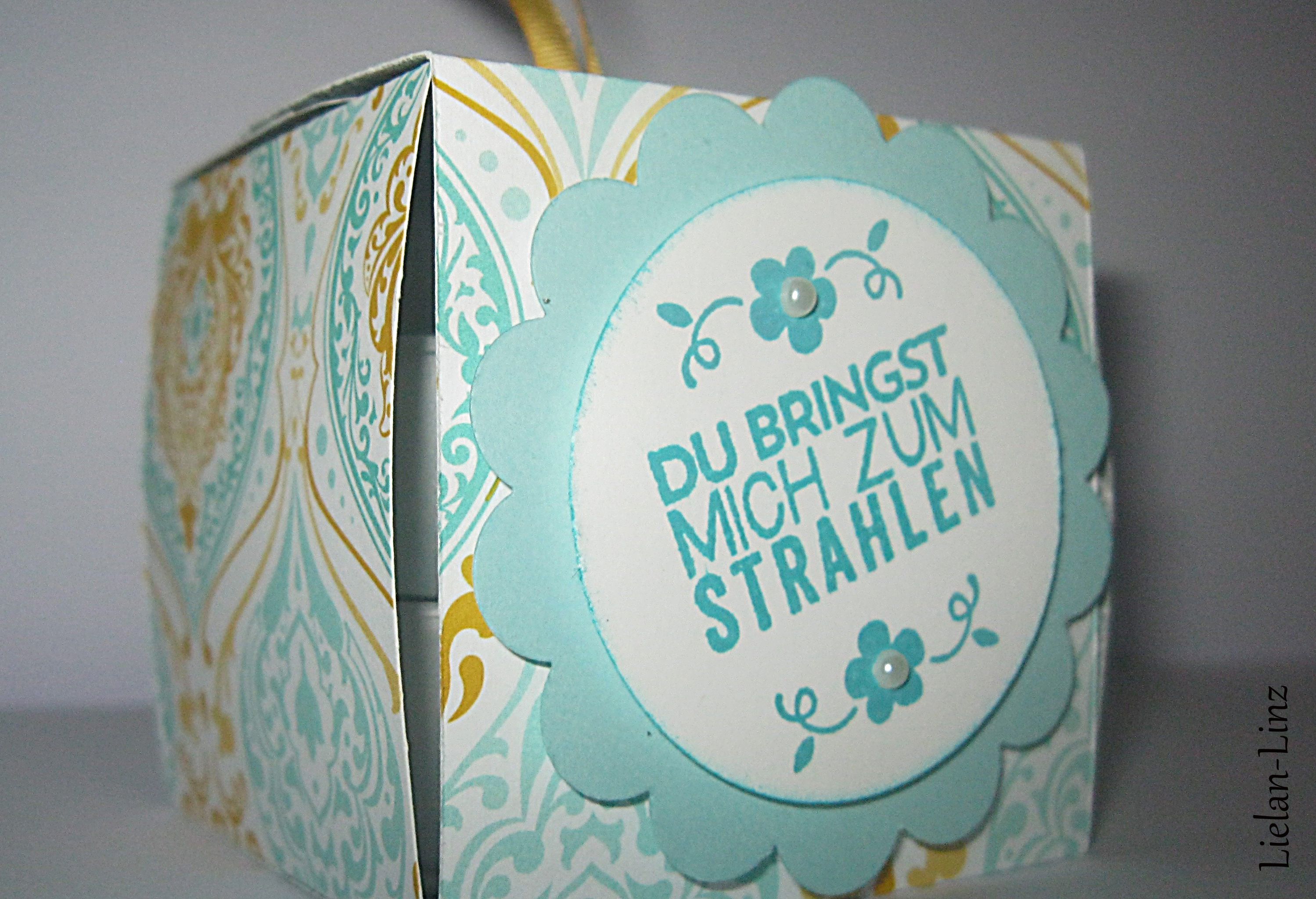 Für die Box selber habe ich das Designerpapier Zauber des Orients verwendet und verschlossen wird diese Box mit einem Band in Curry-Gelb. Für die Dekoration habe ich zuerst mit der 2-3/8 “ Wellenkreisstanze ein Stück in der Farbe Aquamarin ausgestanzt und danach ein Stück Flüsterweiß mit der 1-3/4 “ Kreisstanze. Passend zum Inhalt habe ich mich für den Text „Du bringst mich zum strahlen“ aus dem Set „Sonne im Herzen“ entschieden und zusätzlich habe ich noch die kleine Blütenbordüre aus dem Set „Wie Du bist“ verwendet, dekoriert jeweils mit einer Perle.