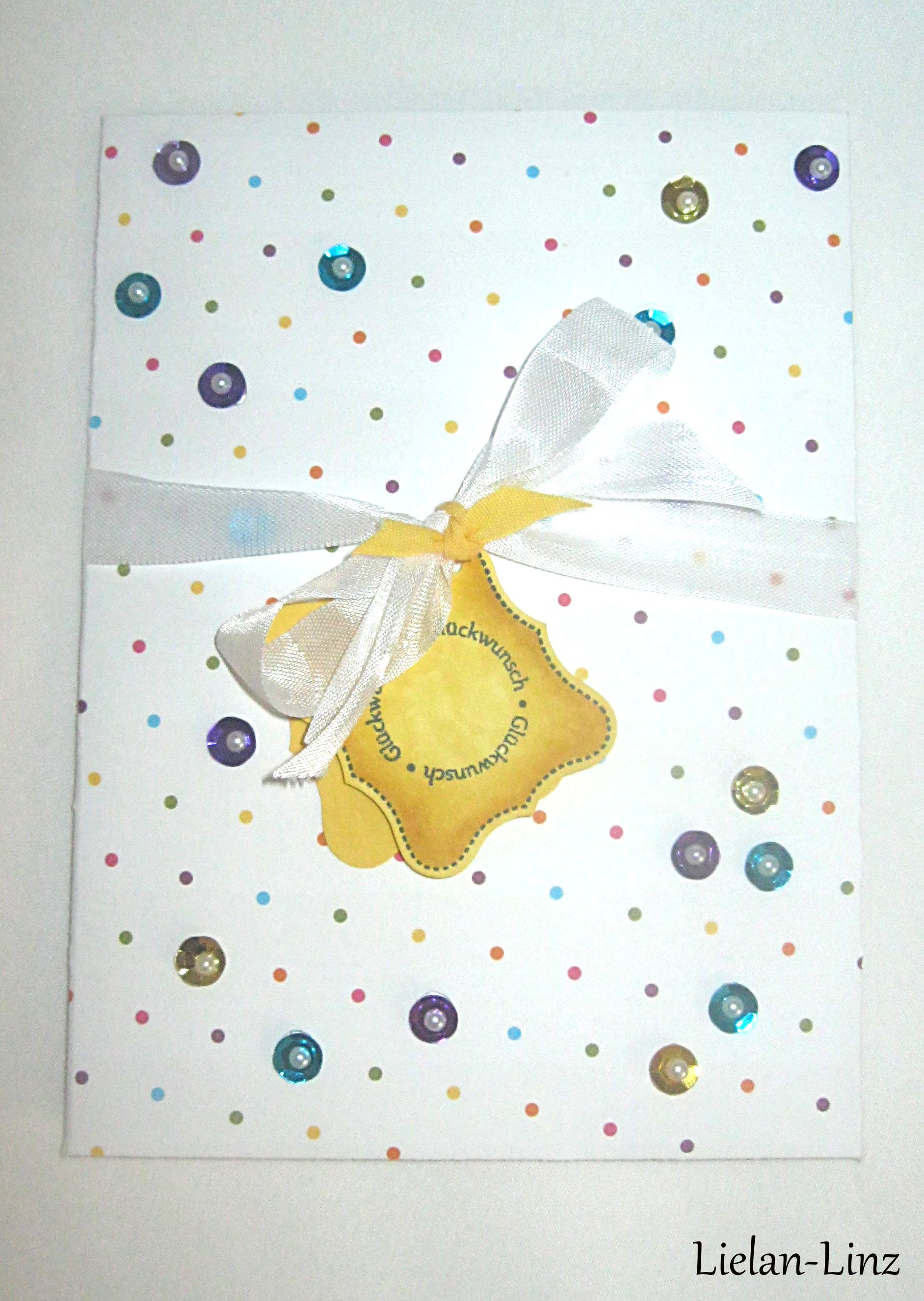 Diese Karte habe ich mit dem Designerpapier Süsse Freude und dem Envelope Punchboard gestaltet. Und weil es meiner Meinung nach für ein Mädchen nie genug Bling-Bling sein kann, habe ich dieses Papier noch mit Pailleten in ähnlichen Farben und Perlen verziert. Der Spruch stammt aus dem Stempelset Ein Gruß für alle Fälle und wurde in Memento Schwarz gestempelt, so dass ich das Papier mit den Mix-Markern in Osterglocke ausmalen konnte. So entsteht dieser tolle Verlauf von dunkler zur hellerer Farbe.