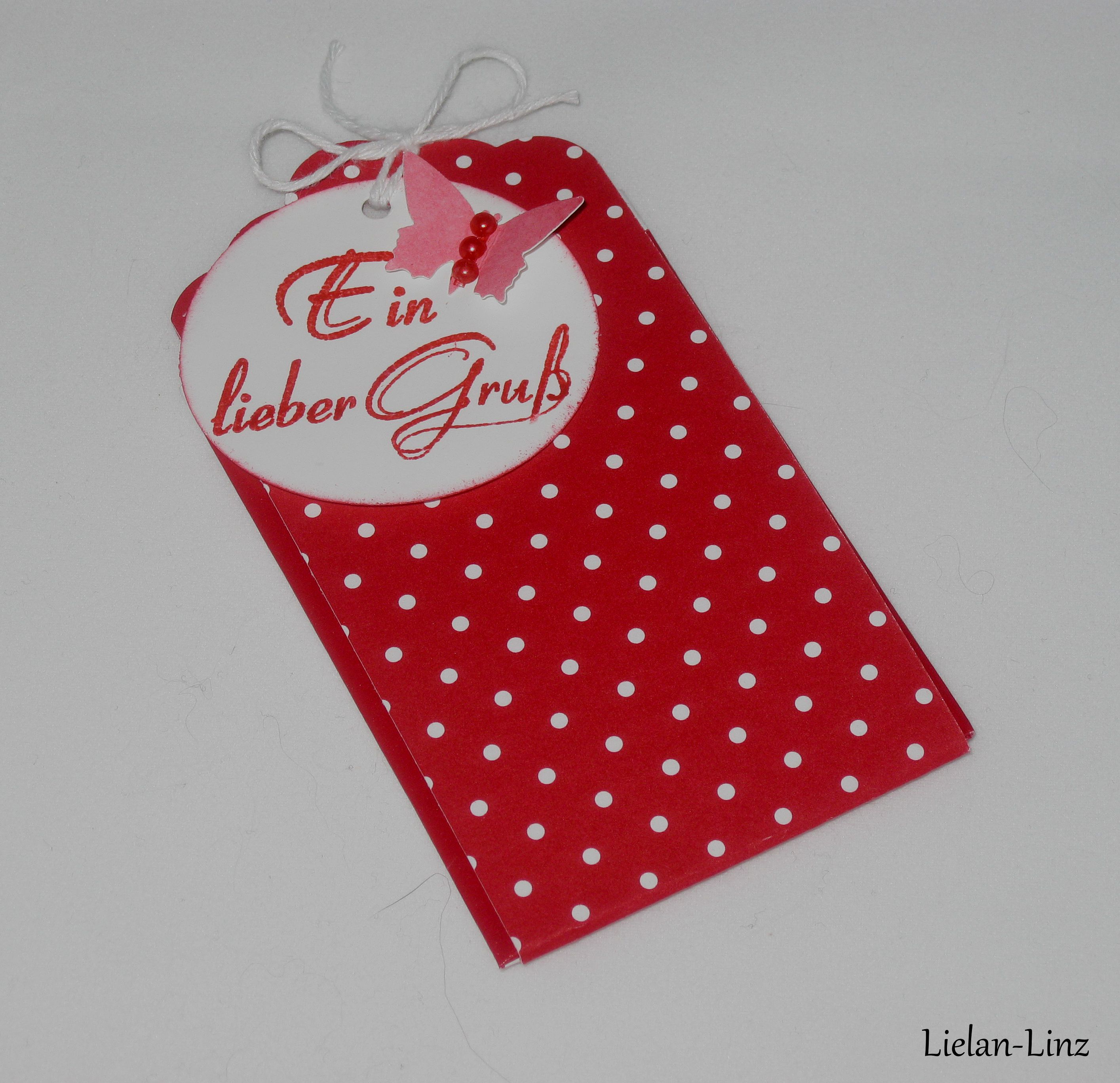 Nachdem der Teebeutel im inneren rot ist (Tee: Tralala aus der Sorte Kunterbunt von EZA Fairtrade) habe ich mich entschieden, dieses Mal auf das Designerpapier im Block Signalfarben zurück zu greifen, weil die Pünktchen in Glutrot absolut perfekt passen. Ich habe einen Streifen mit den Maßen 5 x 20 cm abgeschnitten und an den Enden mit der Stanze Gewellter Anhänger gestanzt. In der Mitte einmal gefaltet und den Teebeutel mit 2 Gluedots gesichert ;-)