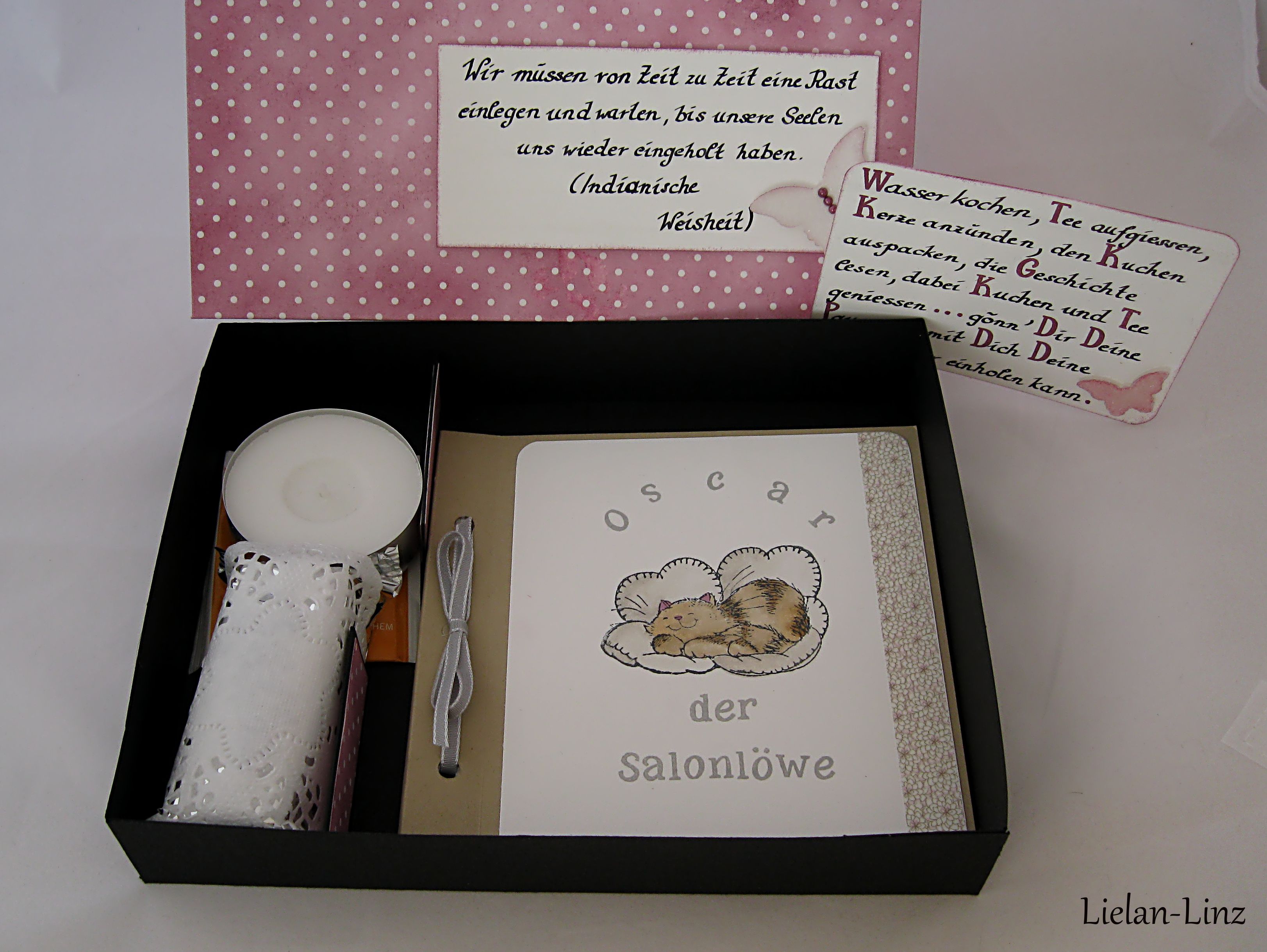 Die Geschichte heisst „Oscar der Salonlöwe“ und ist von James Herriot aus dem Buch „Alles für die Katz“. Ich habe diese Geschichte abgeschrieben und ausgedruckt und dann in Farbkarton Savanne mit einerm Taft-Geschenkband in Silber gebunden. Das Stempelmotiv ist von Penny Black und heisst „The touch of love„. Gestempelt habe ich die schlafende Katze mit Memento Tuxedo Black, damit ich dann problemlos mit Copic Markern colorieren kann. Die Schrift ist in der Farbe Schiefergrau und Riley’s ABC von Lawn Fawn gestempelt.