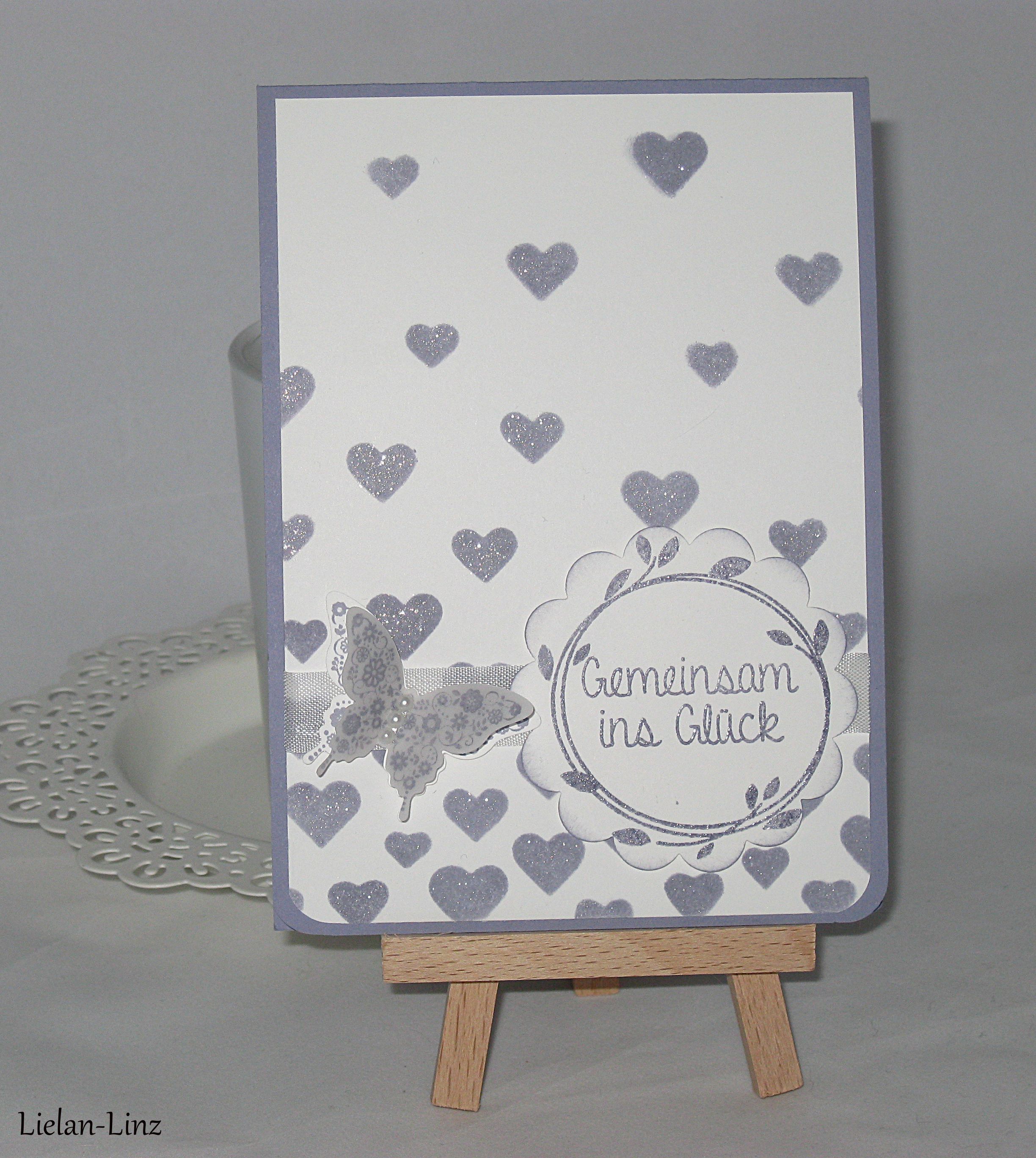 Die Kartenbasis ist in der Farbe Blauregen gehalten und hat die Maße 10,5 x 29 cm und gefalzt in der Mitte bei 14,5 cm. Die 2. Lage ist Flüsterweiß, bestempelt mit der Herz-Schablone in Blauregen. Danach habe ich das Saumband in Flüsterweiß angebracht und darauf findet ihr rechts zwei Stempel aus dem Set Perfekter Tag: einmal den Blätterkreis und dann den Spruch „Gemeinsam ins Glück“. Links davon habe ich einen Schmetterling aus dem Stempelset Papillon Potpourri gewählt. Einmal auf Flüsterweiß gestempelt und einmal auf Pergamentpapier, danach ausgestanzt mit der Stanze „Eleganter Schmetterling„.
