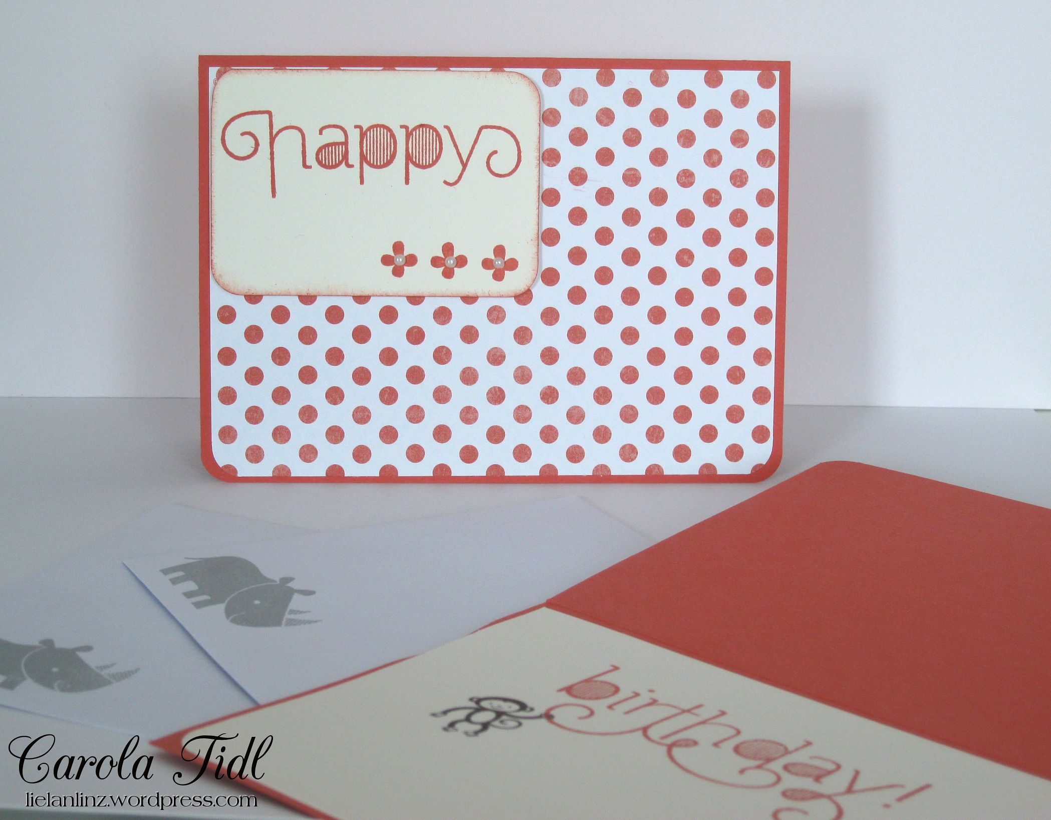 Die Kartenbasis ist in der Farbe Calypso (calypso coral) und hat die Maße 14,5 x 21 cm (gefalzt bei 10,5 cm). Darauf habe ich ein Stück Designerpapier (14 x 10 cm) aus dem Set „Meine Welt“ gewählt, da diese Pünktchen ebenfalls die Farbe Calypso haben. Das „Happy“ sowie das „Birthday“ stammen aus dem Stempelset Age Awareness und sind ebenfalls in Calypso gehalten.