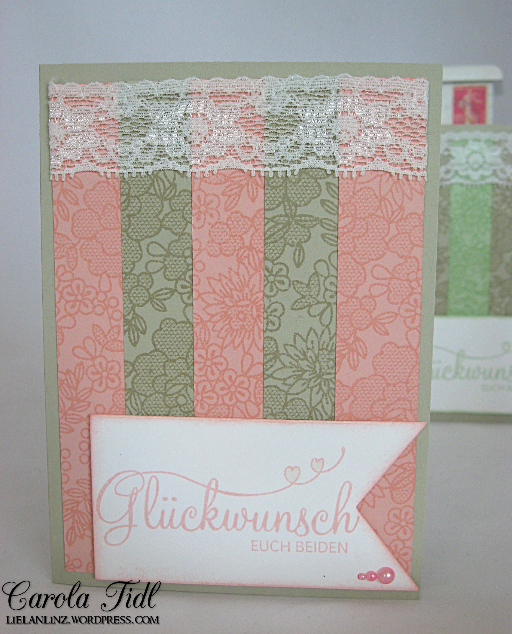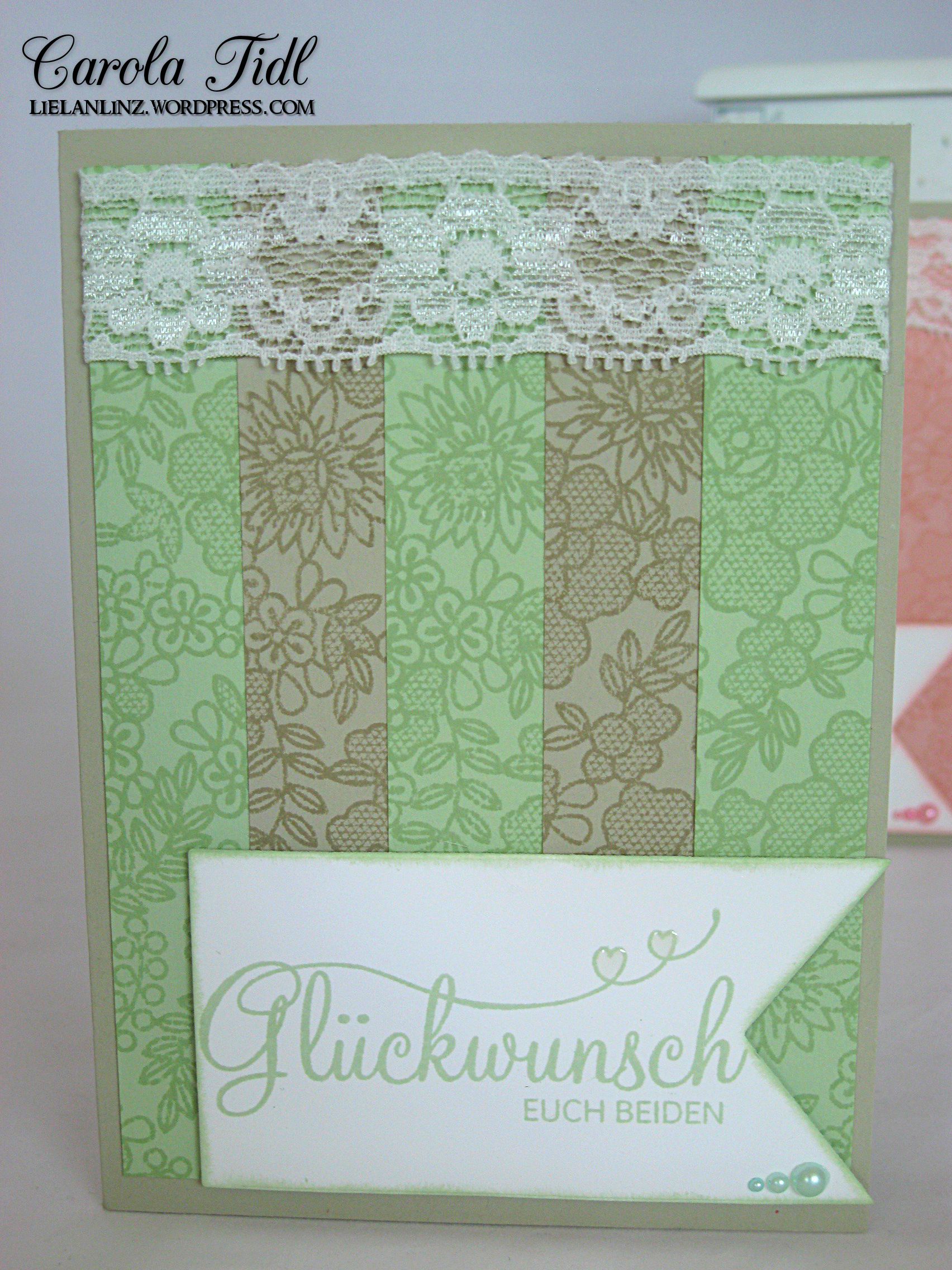 Ich habe mich für Hochzeitskarten entschieden, einmal in der Farbe Pistazie und einmal in Kirschblüte. Das Design ist gestempelt mit dem Hintergrundstempel „Something Lacy“ und der Spruch stammt aus dem Stempelset „Perfekter Tag„.