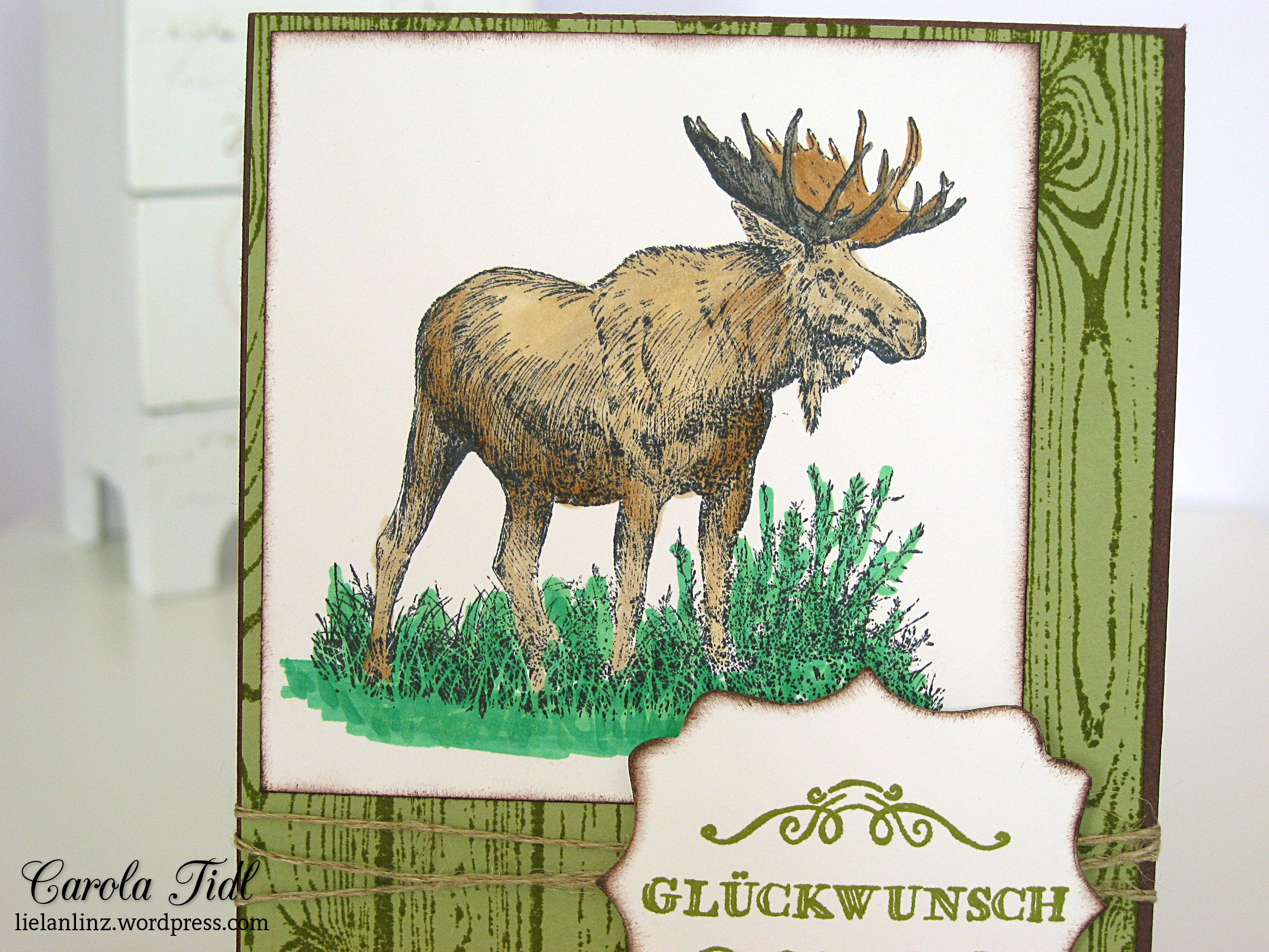 Ich muss gleich mal vorweg sagen, dass mein Papa Jäger ist und mit dem ganzen Mädchen-Chi-Chi nix anfangen kann ;) Daher habe ich versucht, die Karte in seinen Farben (grün und braun) zu halten und nachdem ich weiß, dass in seinem Kopf die Idee von einer Canada-Reise herumspukt, habe ich mich für den Elch (aus dem Stempelset „Walk in the Wild“ von Stampin‘ Up! ©) entschieden.