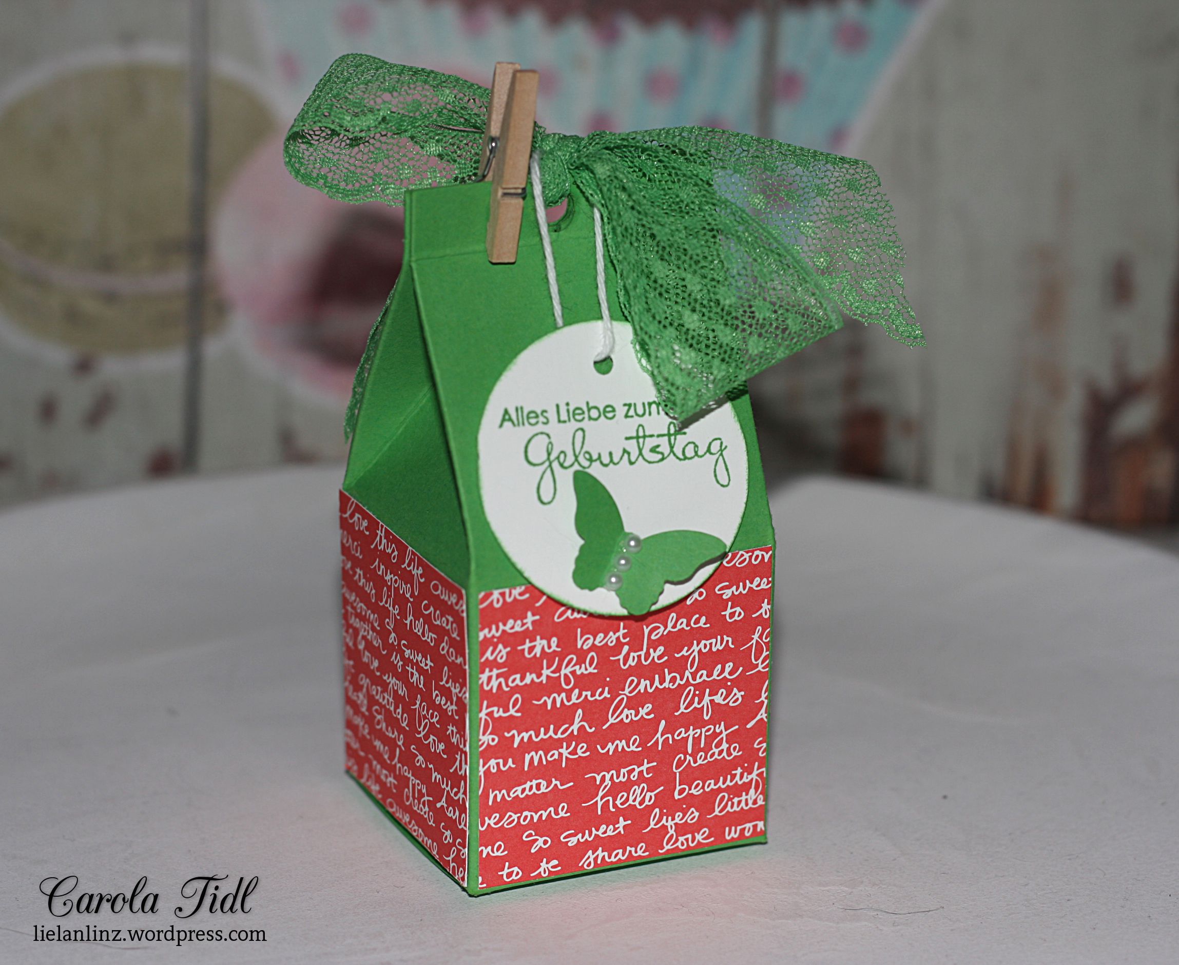 dein kleiner milchkarton sieht sehr schön aus. die gestaltung und die farben gefallen mir. deine meinung zu dem geburtstagsspruch teile ich, ich finde ihn auch so schön und benutze ihn sehr oft. die pünktchenspitzenbänder liebe ich auch, das dekorieren damit macht sehr viel spaß. und sie fühlen sich so schön weich an.