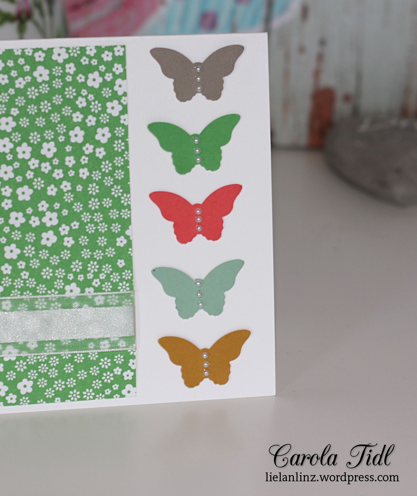 Ich bin ja so ein Schmetterlingfan und am liebsten möchte ich die überall aufkleben :-) aber hier finde ich, passen sie ganz besonders gut. Natürlich kann man diese Art der Farbenpräsenation mit allen Farbfamilien machen, da es das Designerpapier auch in allen Farben gibt.