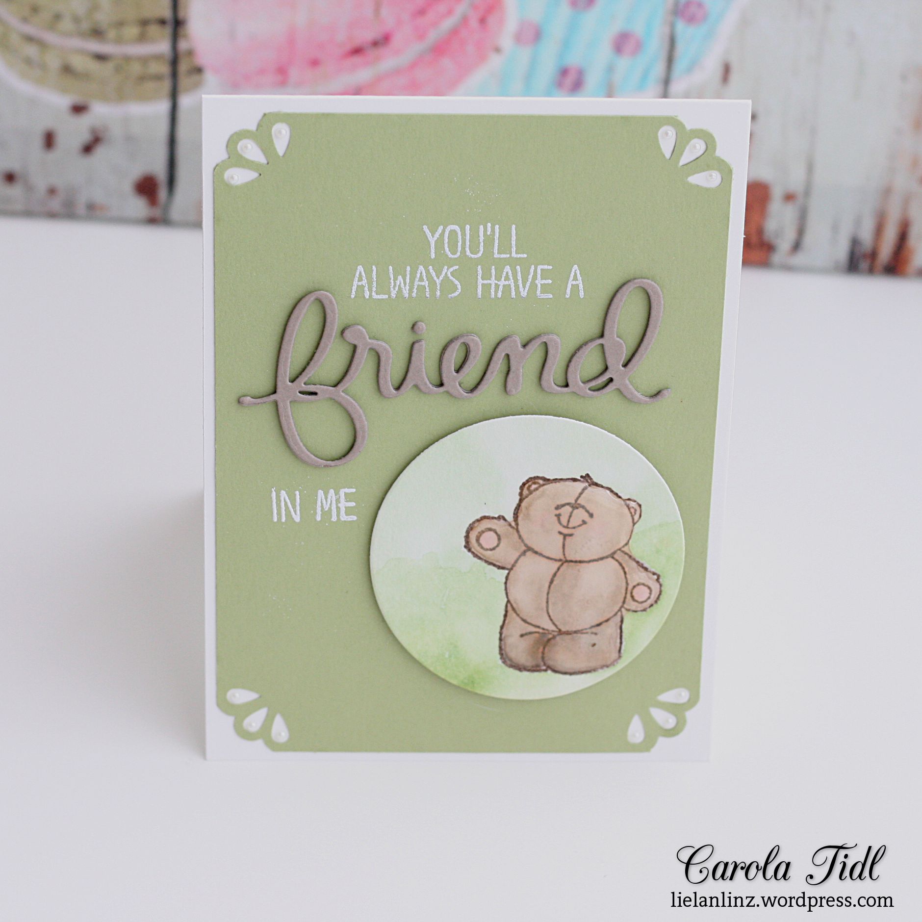 Fokus dieser Karte liegt auf dem gestanzten „friend“ das zum Herbst-Release von Mama Elephant gehört. Das Stempelset nennt sich „Friend indeed“ und zum Schriftzug gibt es die gleiche Stanze. Ausgestanzt habe ich den Schriftzug insgesamt 4 mal um etwas Dimension zu erzeugen und verwendet habe ich Farbkarton in Taupe. Der Spruch ist aus dem gleichen Stempelset und wurde weiß embosst.