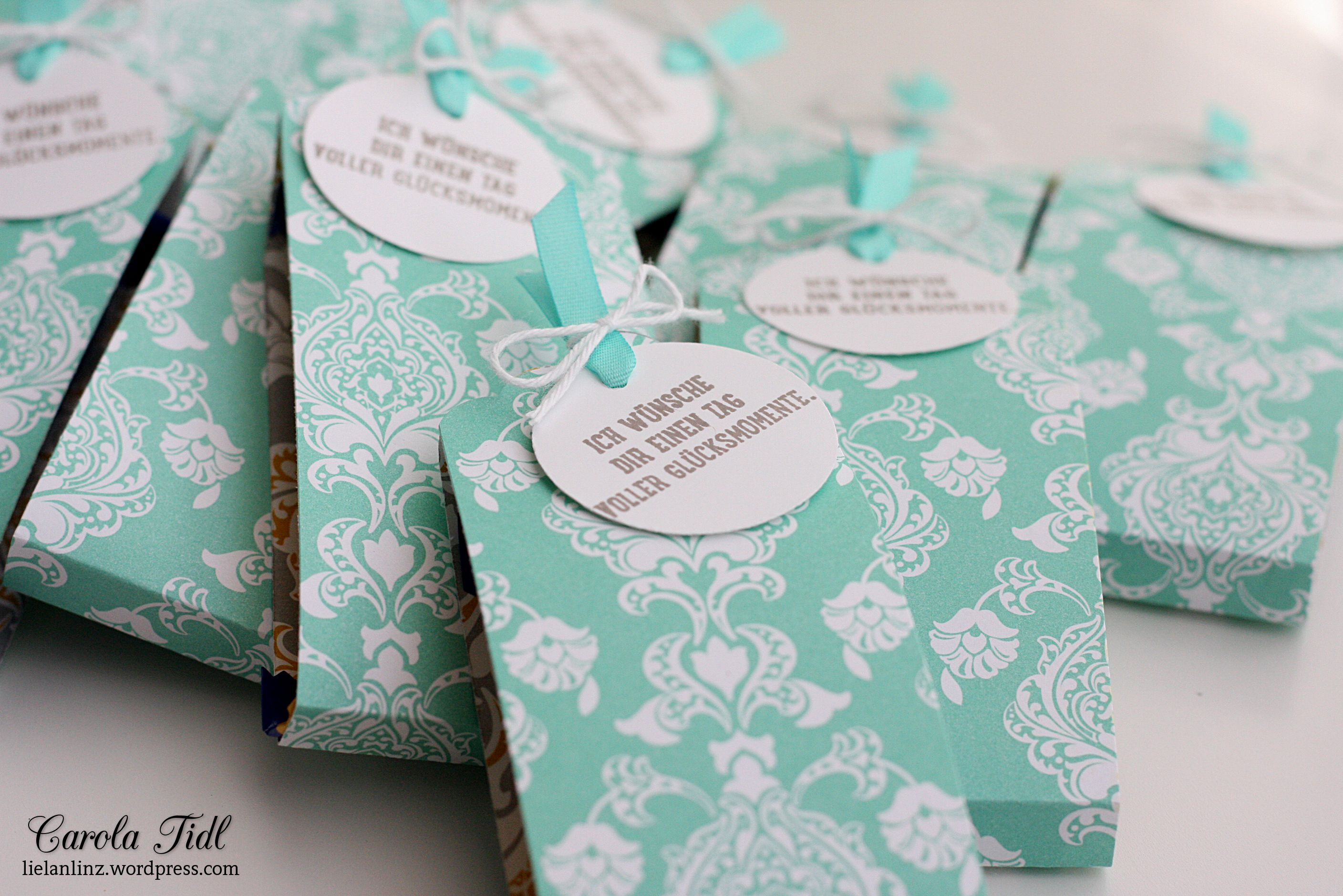 Letzten Donnerstag hatte ich einen Workshop in extrem lustiger und gemütlicher Bastelrunde. Natürlich wollte ich dort nicht mit leeren Händen ankommen und hab für die Gastgeberin und ihre Freundinnen ein paar süße Goodies mitgebracht. Schnell gemacht aus einem Streifen Papier mit den Maßen 25 x 5 cm und die Enden gestanzt mit der Stanze „gewellter Anhänger“ von Stampin‘ Up!
