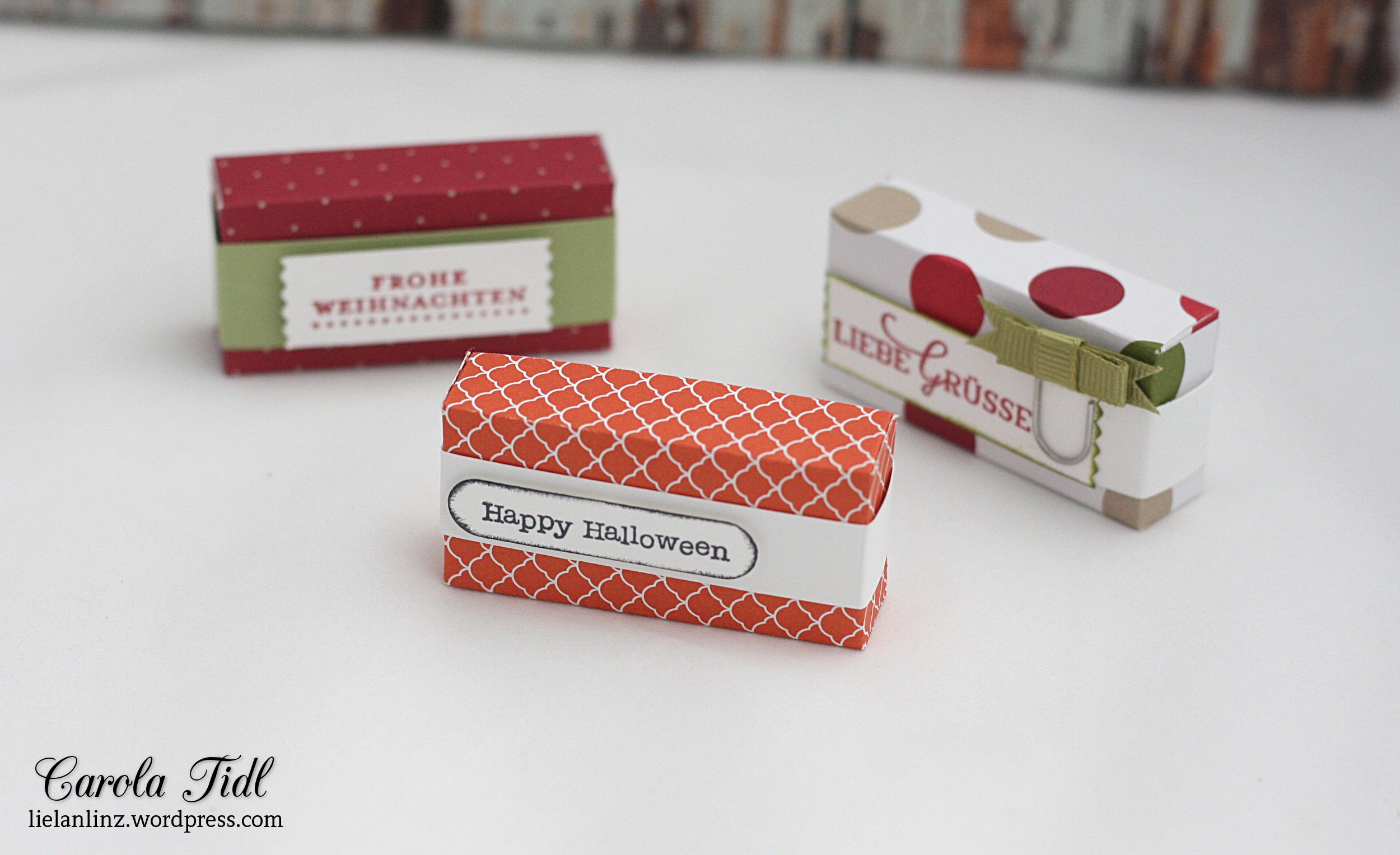 Ich hab für dieses Projekt verschiedene Designerpapiere von Stampin‘ Up! verwendet wie z.B. das Designerpapier im Block „Fröhliche Feiertage“. Dazu passen perfekt die Farben Chili und Olivgrün. Das Halloween-Päckchen ist in der Farbe Kürbisgelb gehalten und der Schriftzug ist schwarz gestempelt.
