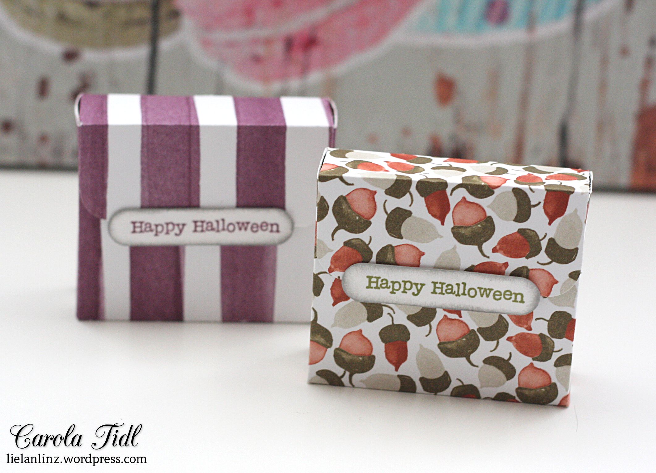 Das „Happy Halloween“ stammt dieses Mal aus dem Stempelset „Kleine Wünsche“ von Stampin‘ Up! und ist einmal in Himbeerrot und einmal in Olivgrün gestempelt; ausgestanzt mit der Wortfensterstanze und dient dazu, den Deckel zu halten und die Box somit zu verschließen.