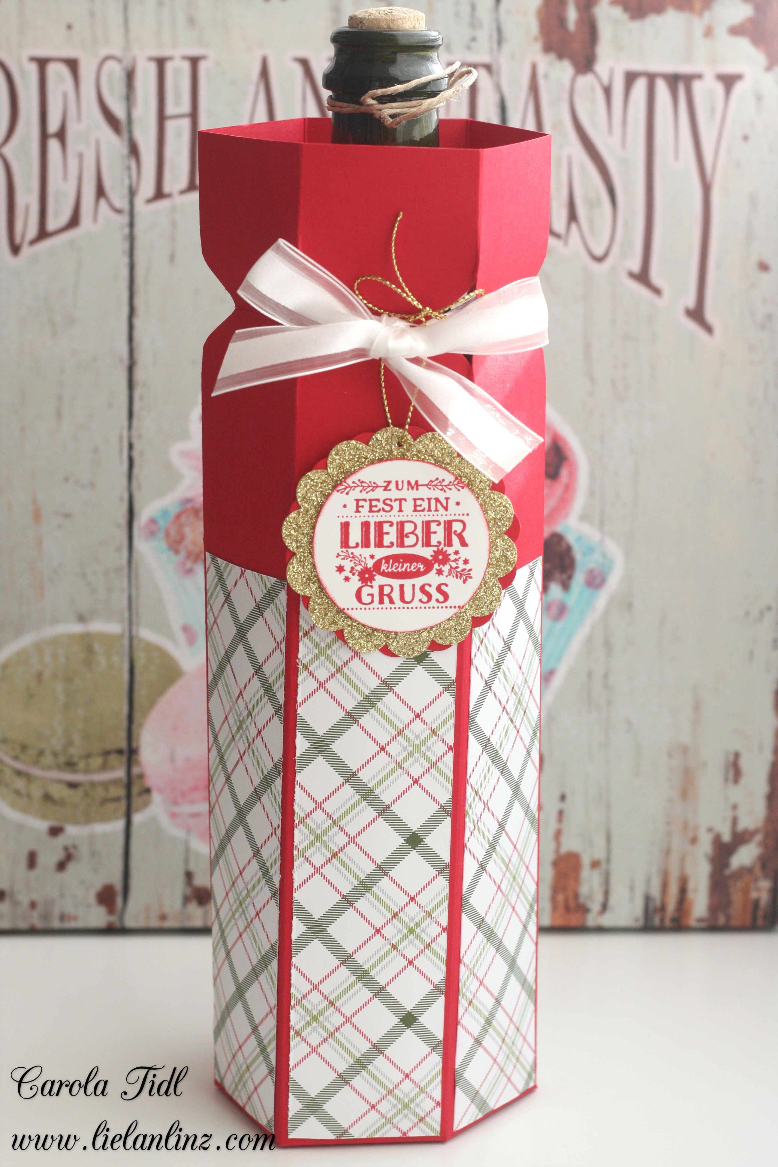 Nicht nur, dass es eine eigene Facebook-Gruppe gibt, die sich ausschließlich mit Punch Boards beschäftigt … es tauchen auch im Netz (Pinterest, YouTube, Instagram) immer mal wieder Verpackungen auf, die man damit einfach und schnell zaubern kann. So auch gesehen vor einiger Zeit bei Eva von kritzelherz.com, sie hat eine Verpackung für eine kleine Likörflasche gemacht. Super Idee – umgerechnet, abgewandelt und angepasst und aus einer Likörflaschenverpackung ist eine für Prosecco entstanden.