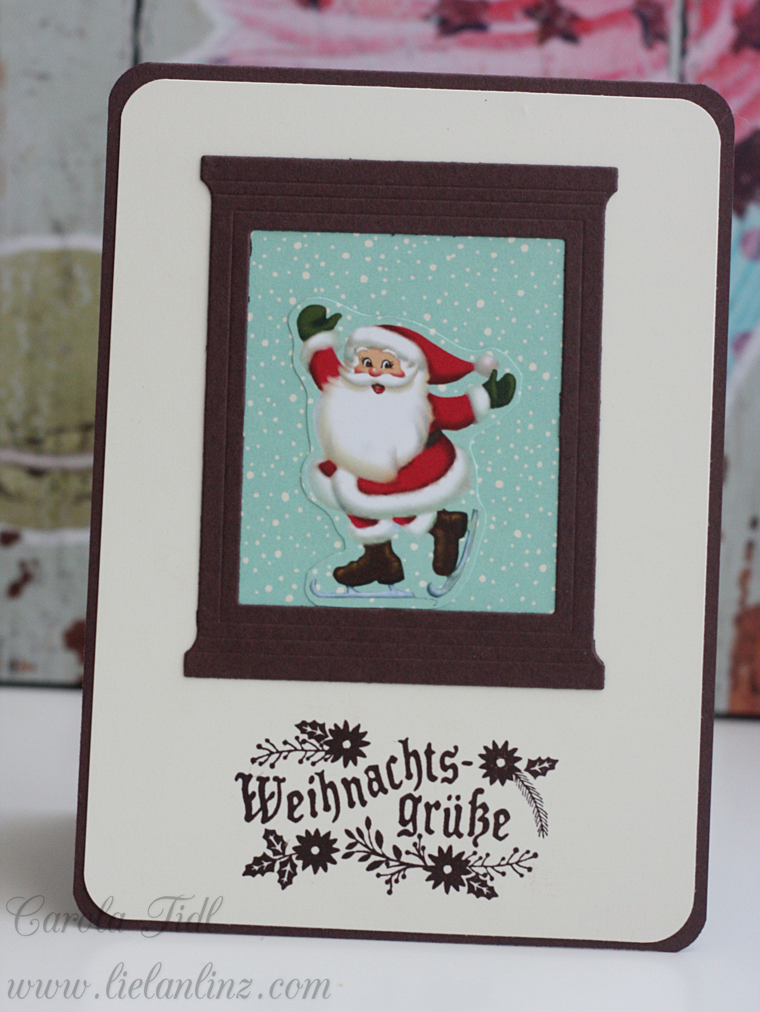 Der Weihnachtsmann und sein Hintergrund sind aus dem Designerpapierpaket „Heimelige Weihnachten“ und die Umrandung ist mit den Thinlits Formen „Trautes Heim“ in Schokobraun gestanzt.