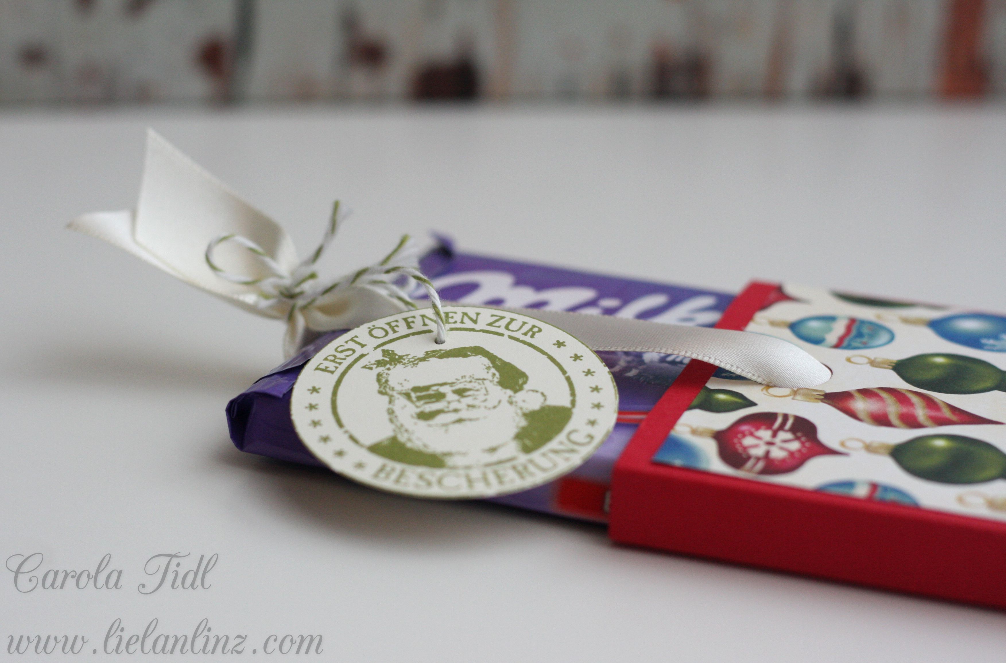 Weihnachten ist die Zeit von Süßem … Schokolade, Kekse, Lebkuchen … passt alles wunderbar in diese Zeit. Und manchmal möchte man diese Süßigkeiten auch nett verpackt verschenken, daher zeige ich euch heute eine Schokoladenziehverpackung, die wir vor kurzem in einem Workshop gebastelt haben.