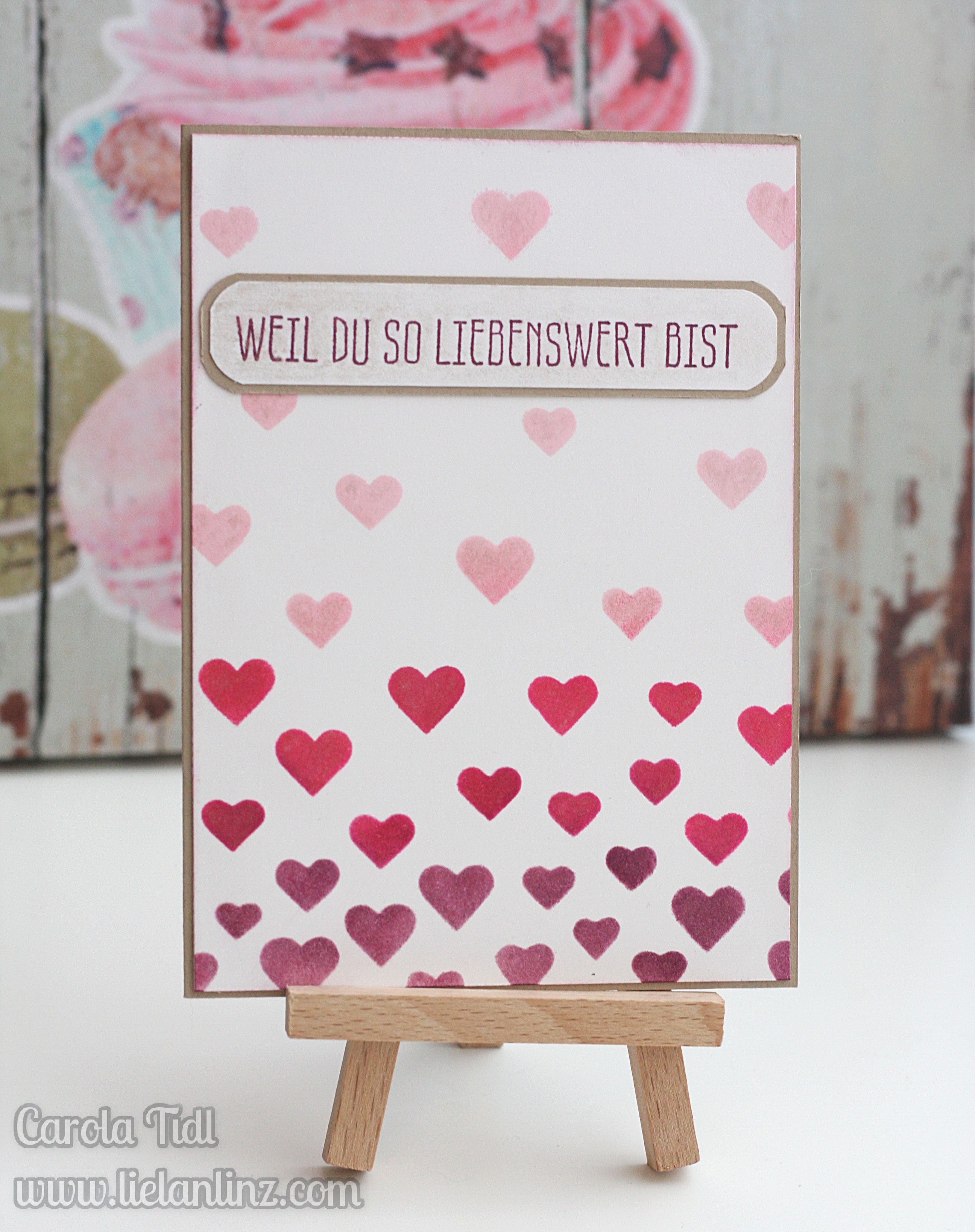 Bei dieser Karte hab ich mich mal ein bisschen mit unserer Herzschablone (Seite 157 im Jahreskatalog) ausgetobt … ich finde, dass unsere Schablonen sowieso viel zu selten eingesetzt werden :-)