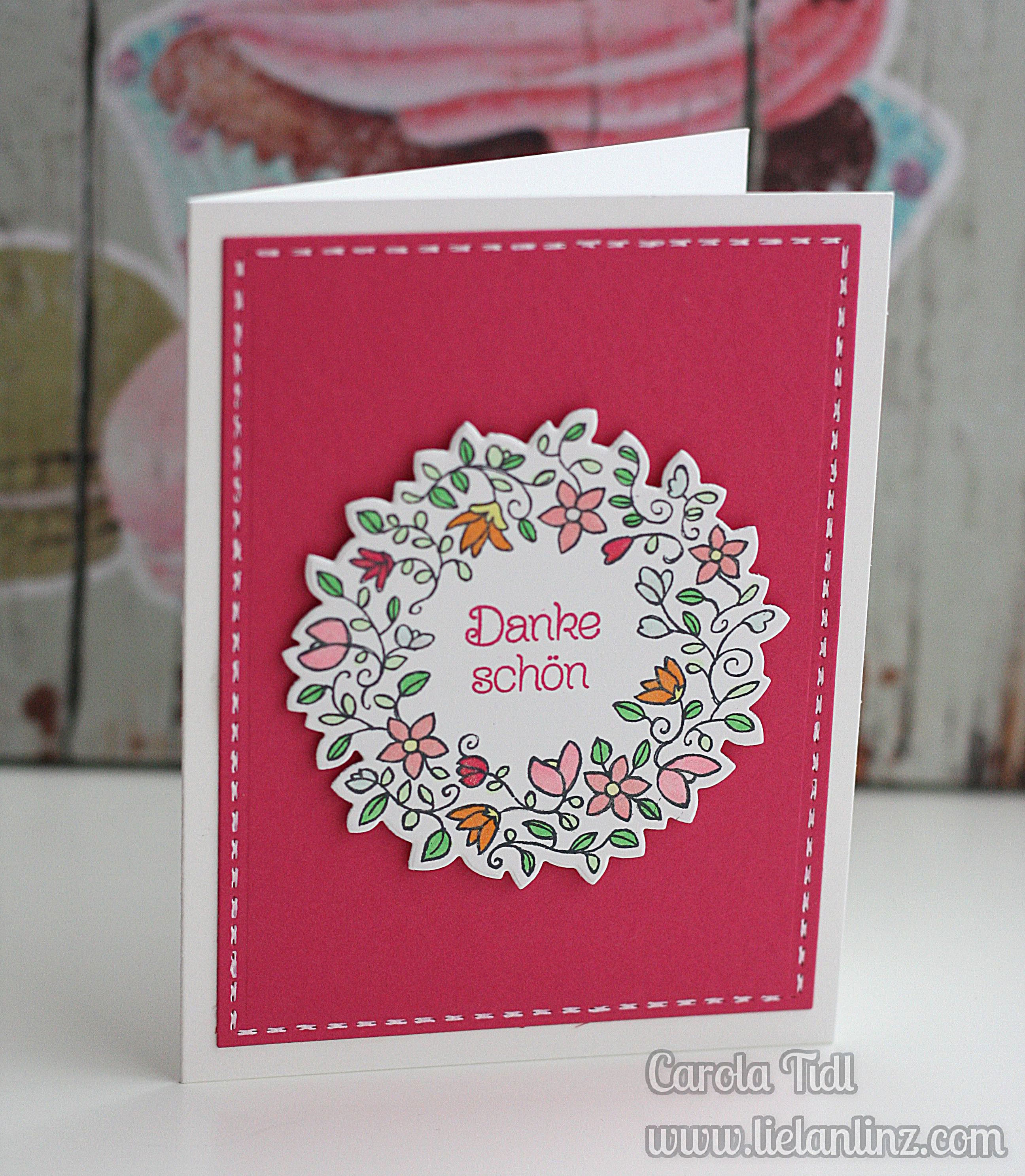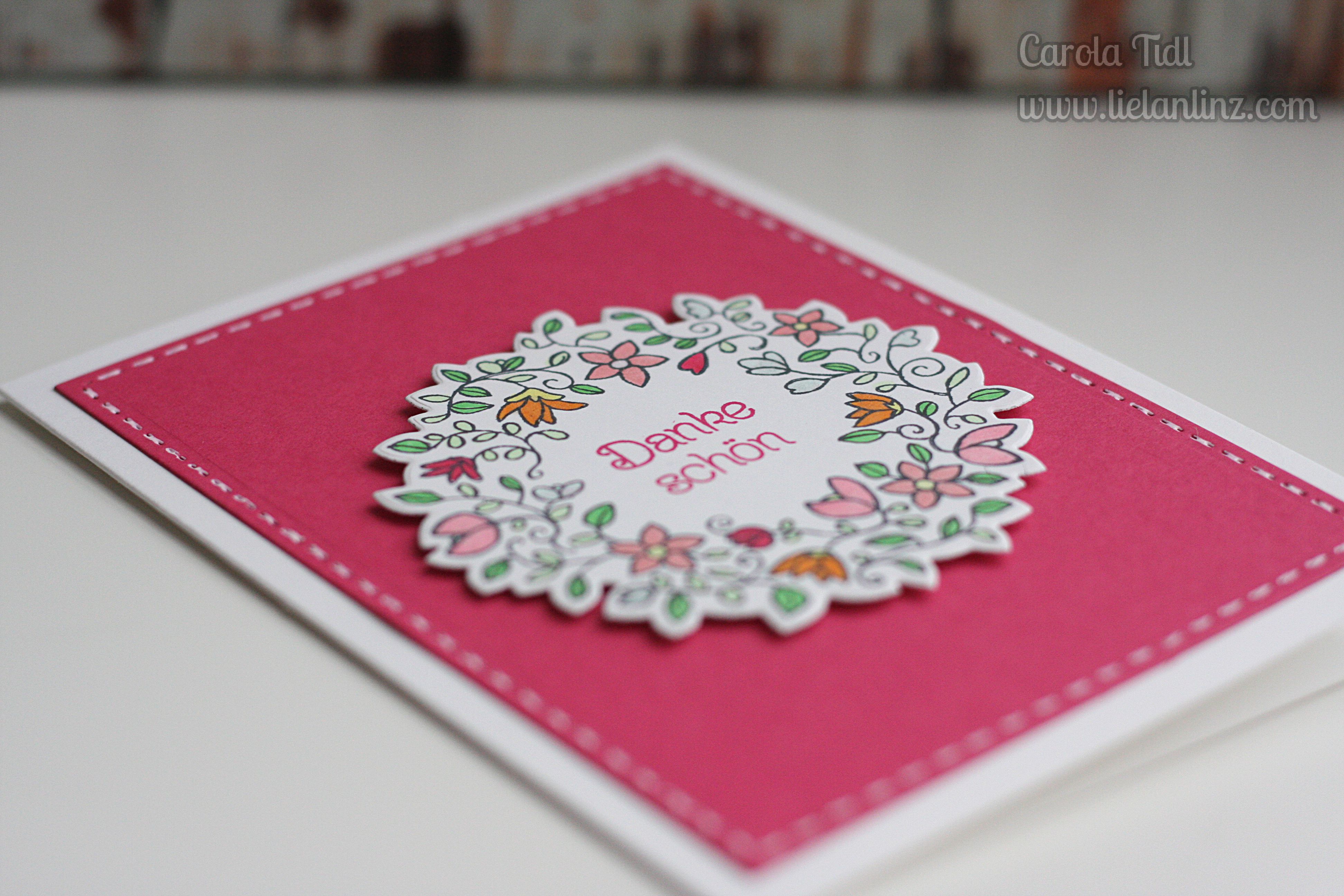 Der Blütenkranz stammt aus dem Stempelset „Frühlingsreigen“, ebenso das „Danke schön“. Den Kranz habe ich in Memento Schwarz gestempelt, so dass ich ihn mit Copic Markern colorieren konnte – ausgestanzt wird der Kranz mit der BigShot und den Framelits „Willkommen, Weihnacht!“.