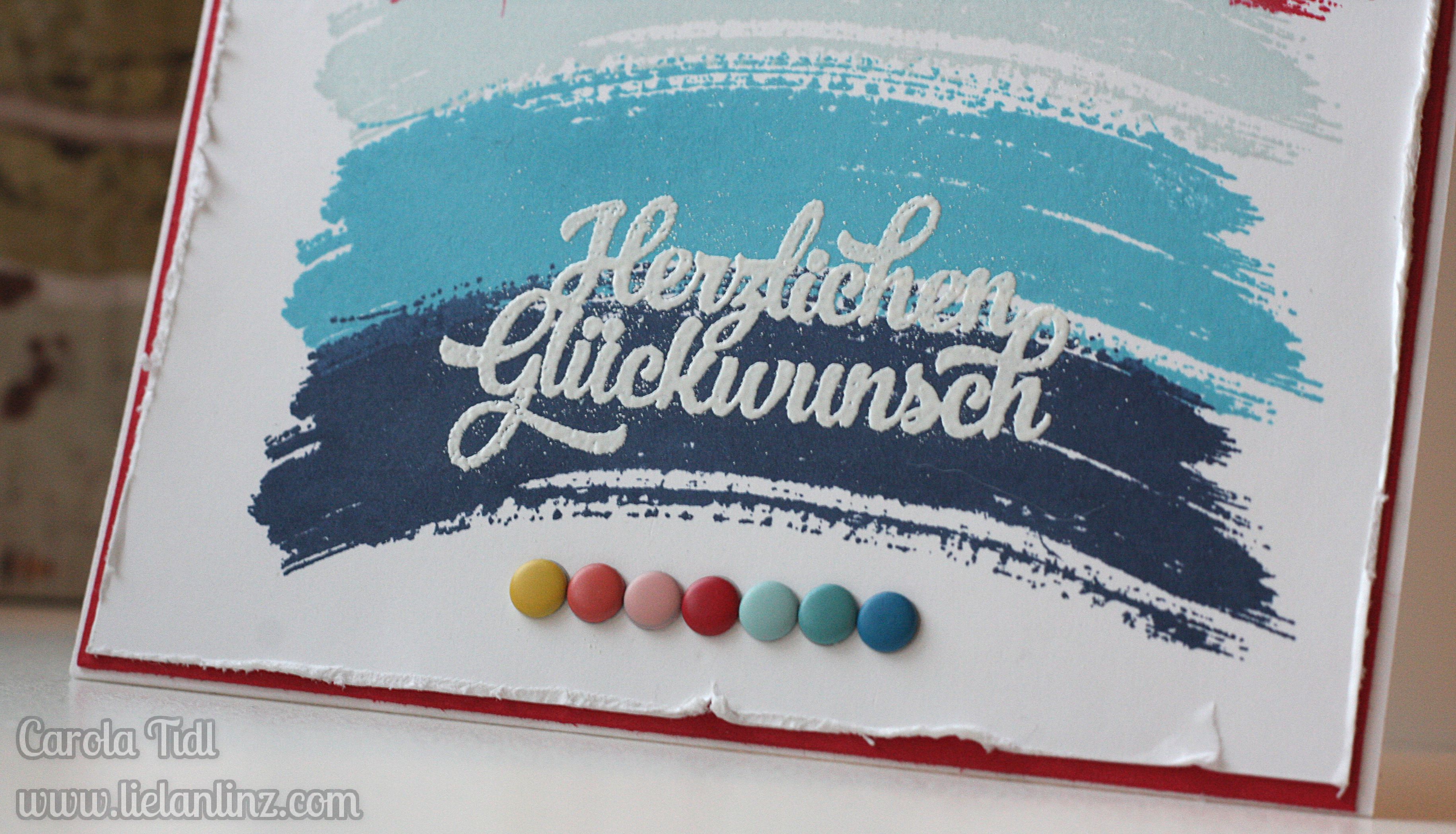 Der Spruch stammt aus dem Stempelset „Grußelemente“, zu dem es auch in passendes Projektset gibt. Ich habe den Spruch weiß embosst und darunter Süße Pünktchen in den Farben und in der Farbfolge geklebt, in der ich gestempelt habe.