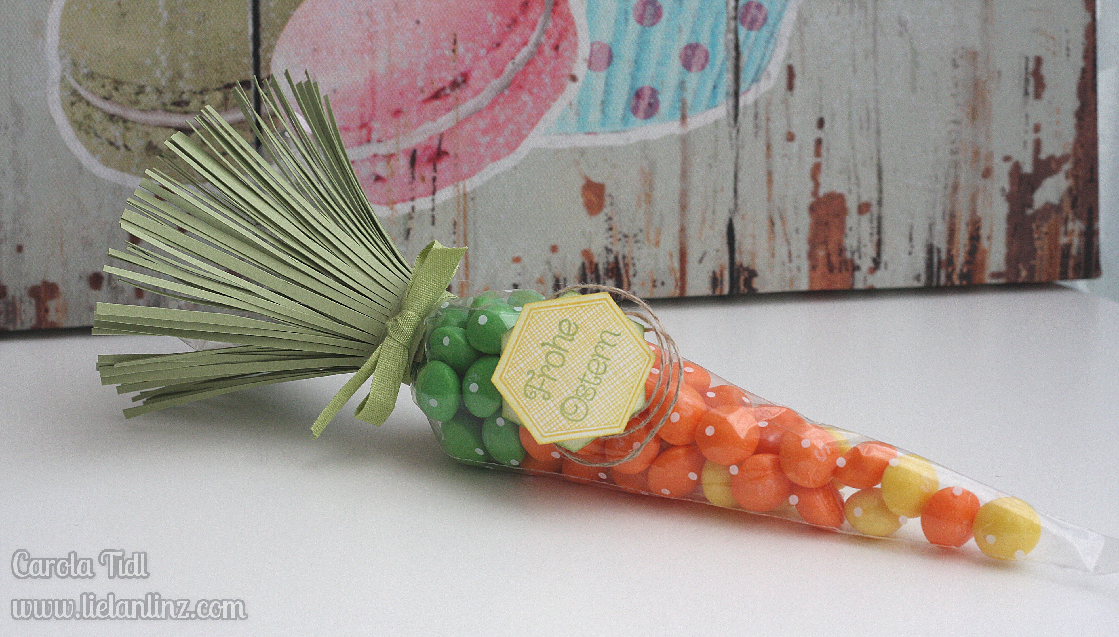 Ich habe hier die Kegel-Zellophantüten aus dem aktuellen Frühjahrskatalog mit gelben, orangen und grünen Skittles befüllt. Das Grünzeug der Karotte ist Farbkarton in Farngrün: 29,7 x 8 cm – eingeschnitten bis zu einem Rand von ca. 1 cm. Die Zellophantüte habe ich erst mit einer weißen Kordel verschlossen und anschließend das Grünzeug mit Abreißklebeband angeklebt.