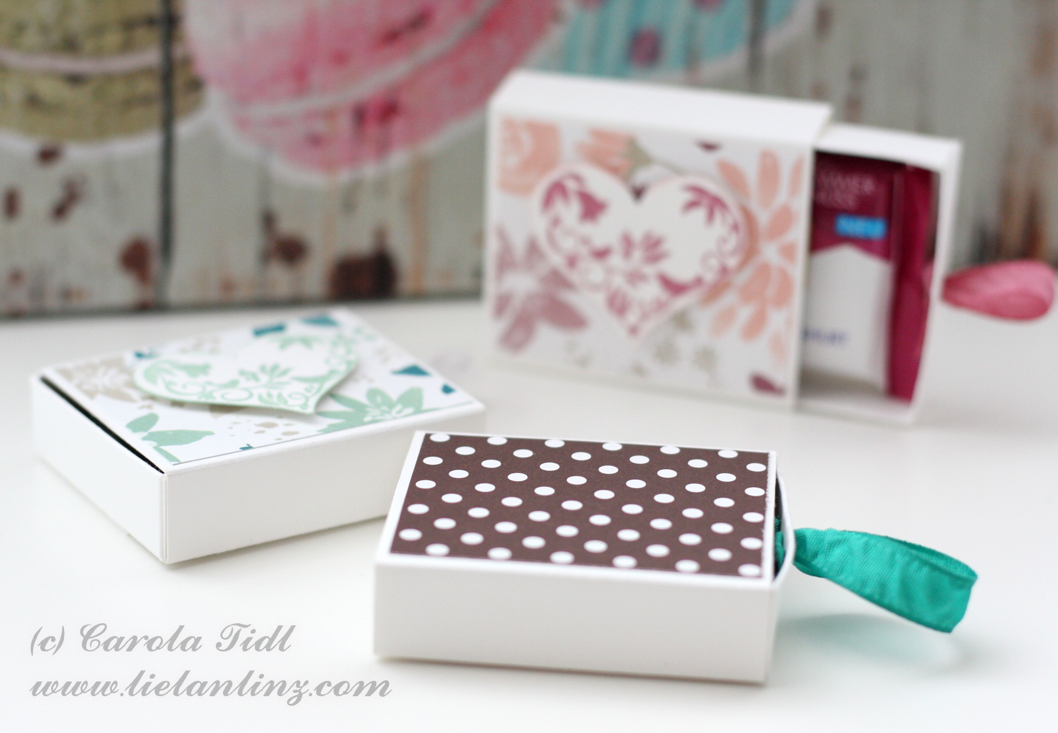 Bereits am 13. Juli hatte ich diese süßen Mini-Ziehverpackungen (aka Matchbox) auf meinem Blog zu sehen (hier ist der Link). Nachdem ich von einer ganz lieben Kundin nach einer Anleitung gefragt wurde, gibt’s heute das Video dazu.