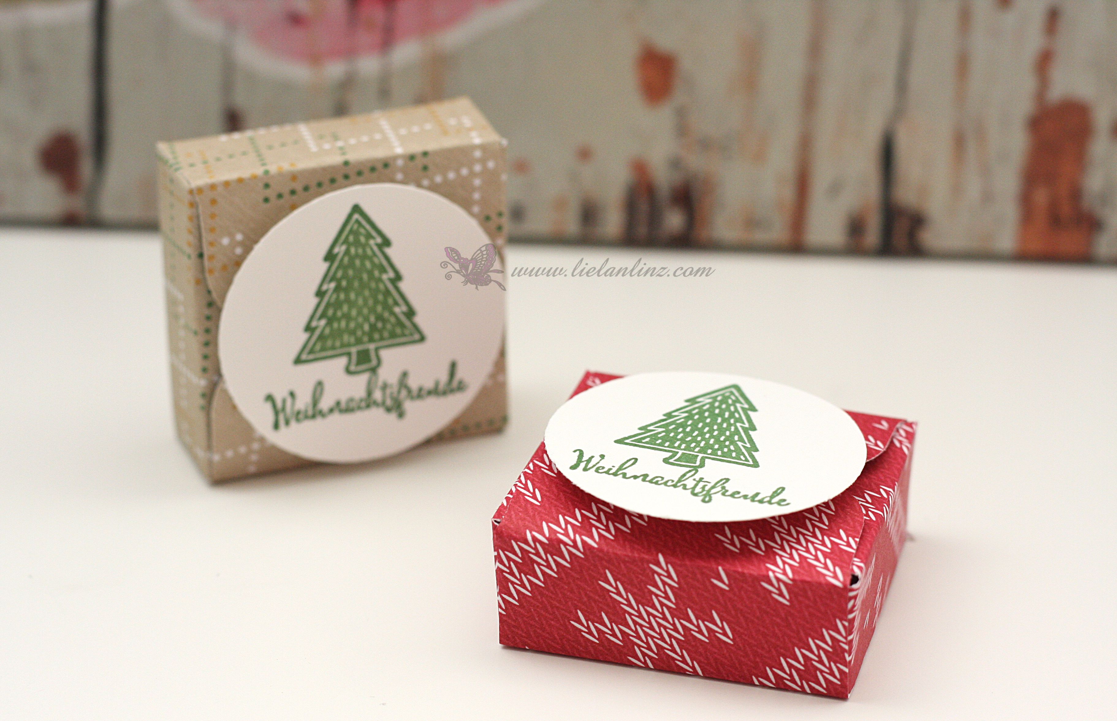 Zugeklebt wird die Box mit einem Mini-Klebepunkt und den Spruch befestigen wir mit einem Stampin‘ Dimensional.