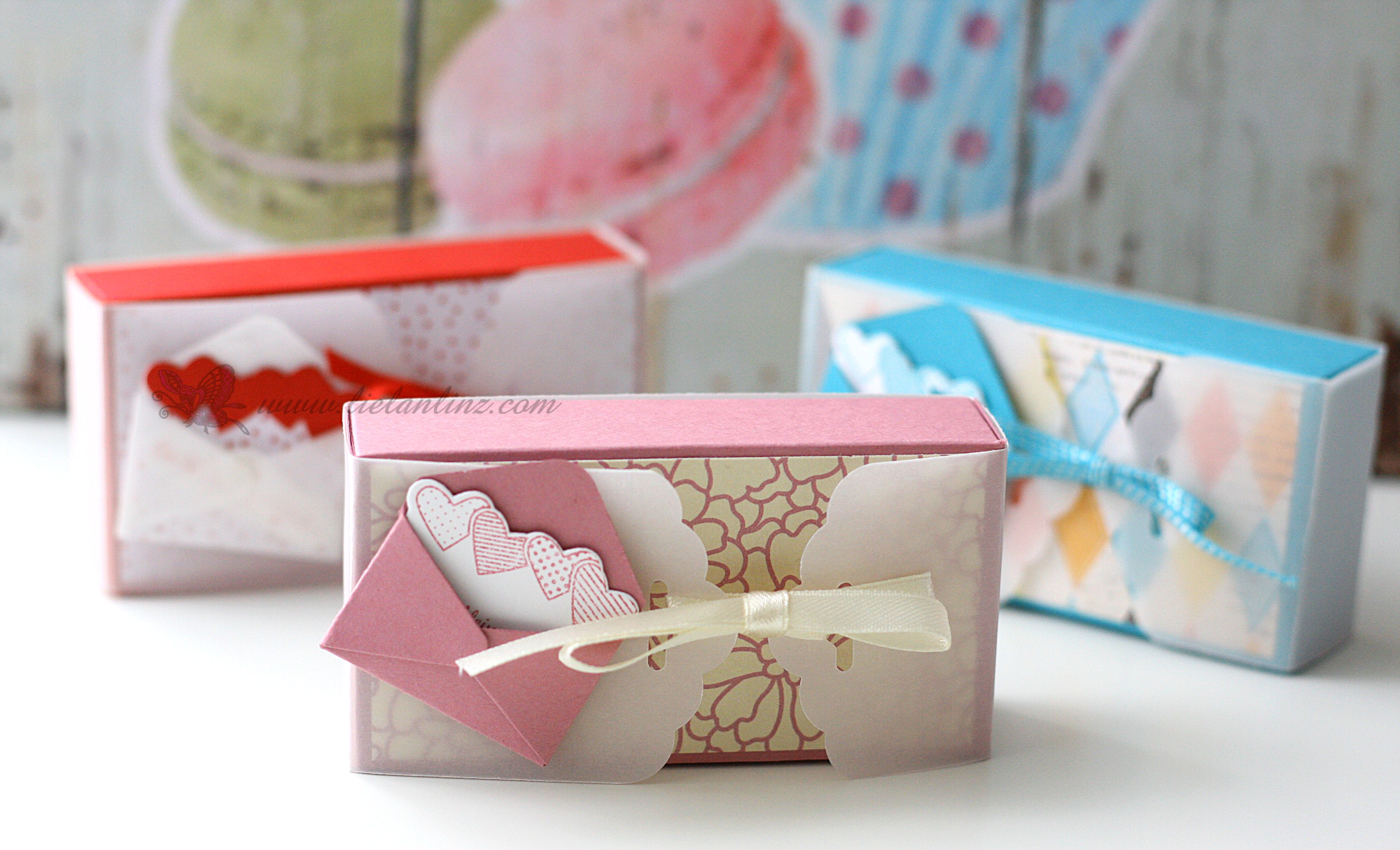 Ich habe zwei Probemodelle gewerkelt (in Glutrot und Bermudablau) und im Video verwenden wir Zarte Pflaume und das Designerpapier „Zum verlieben“.