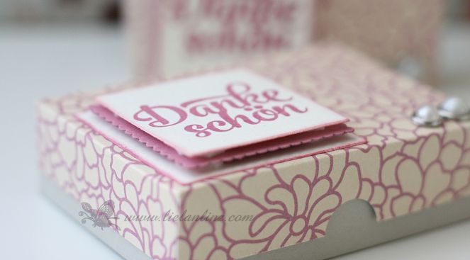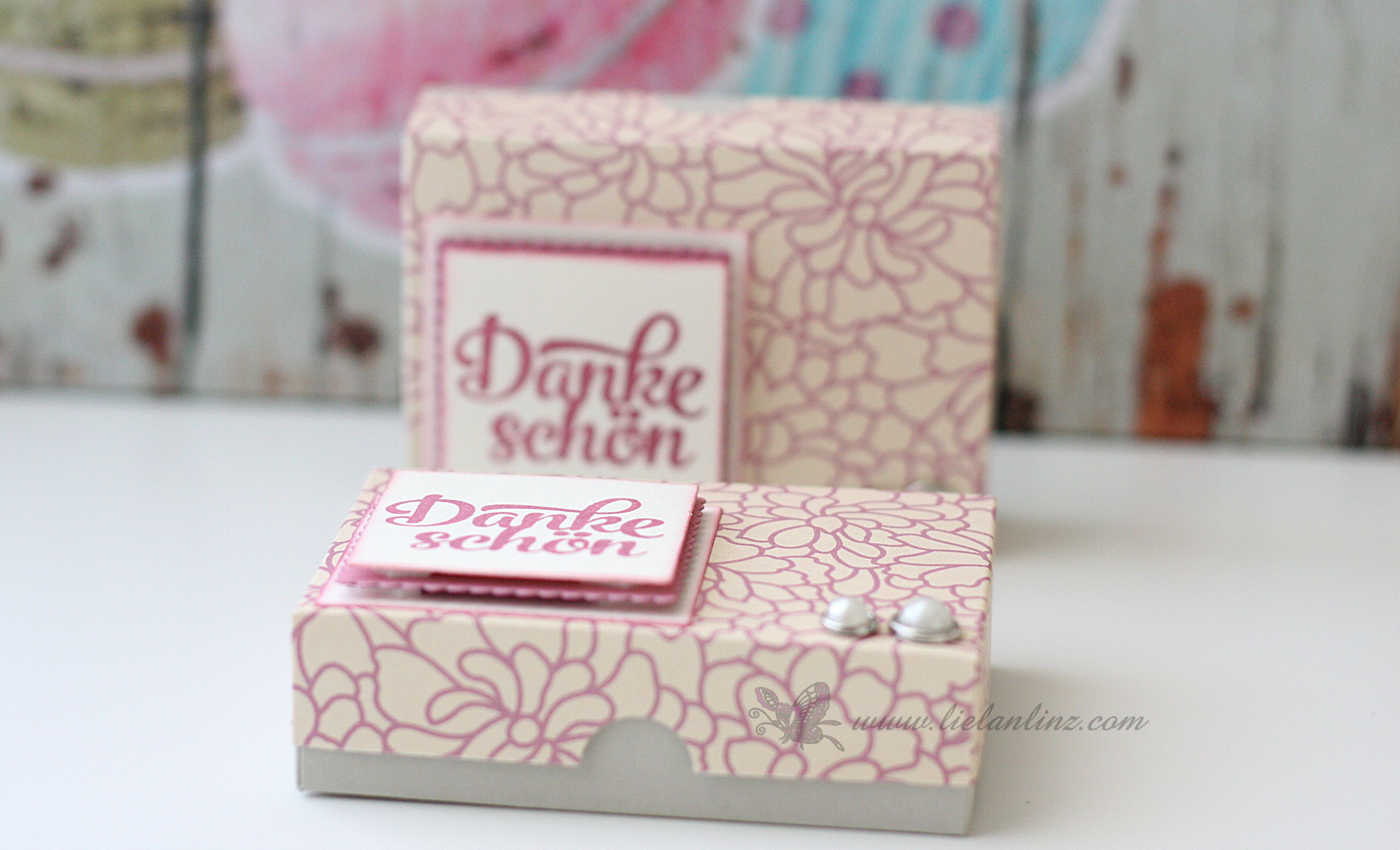 Die fertigen Maße der Box sind 5.5 x 7.5 x 2 cm … und gearbeitet wird mit Farbkarton in Saharasand und DSP „Zum Verlieben“.