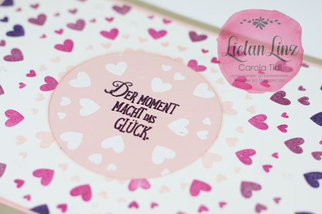 Dann habe ich mit Flüsterweiß (13,4 x 9,4) weiter gemacht. In diese Karte habe ich einen Kreis gestanzt. Danach die Herzen in den Farben Puderrosa, Sommerbeere, Himbeerrot und Aubergine im Kreis herum gestempelt.