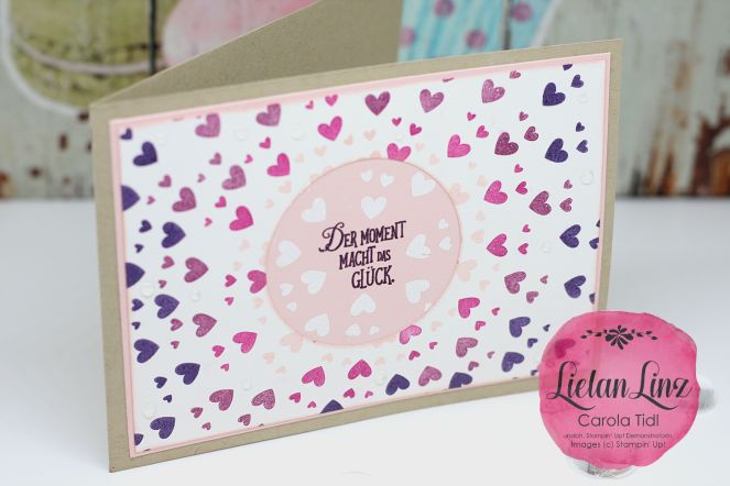 Ich habe mich für eine Karte entschieden, die über und über mit den kleinen Herzen aus dem Stempelset versehen ist … die nächste Hochzeitssaison kommt ja garantiert *gg*