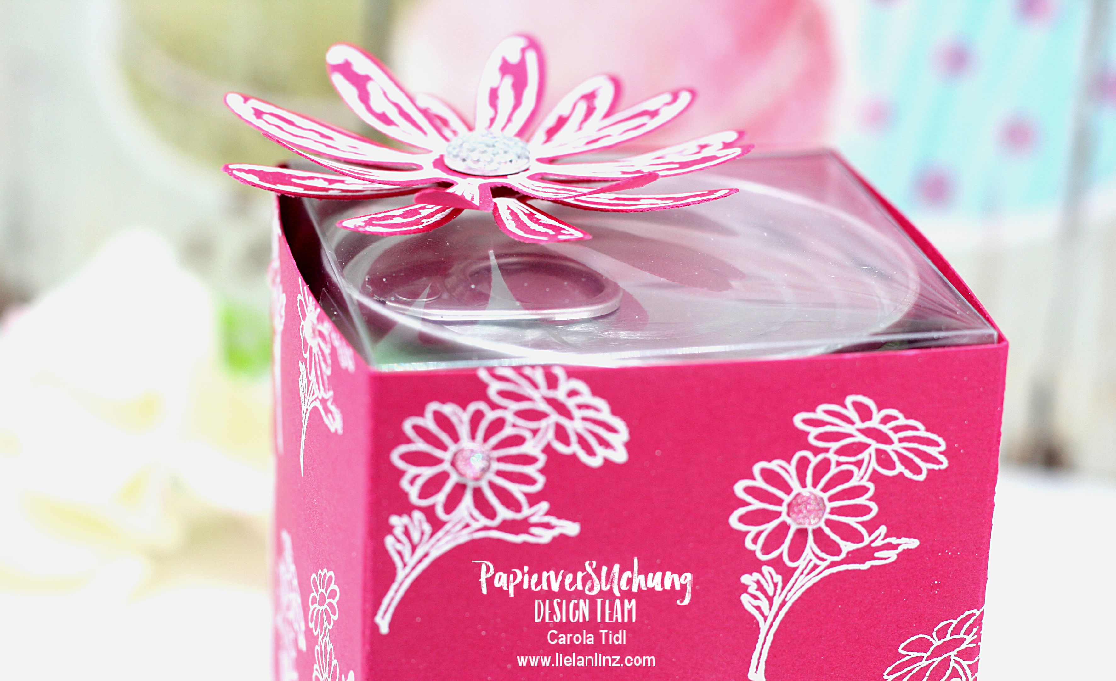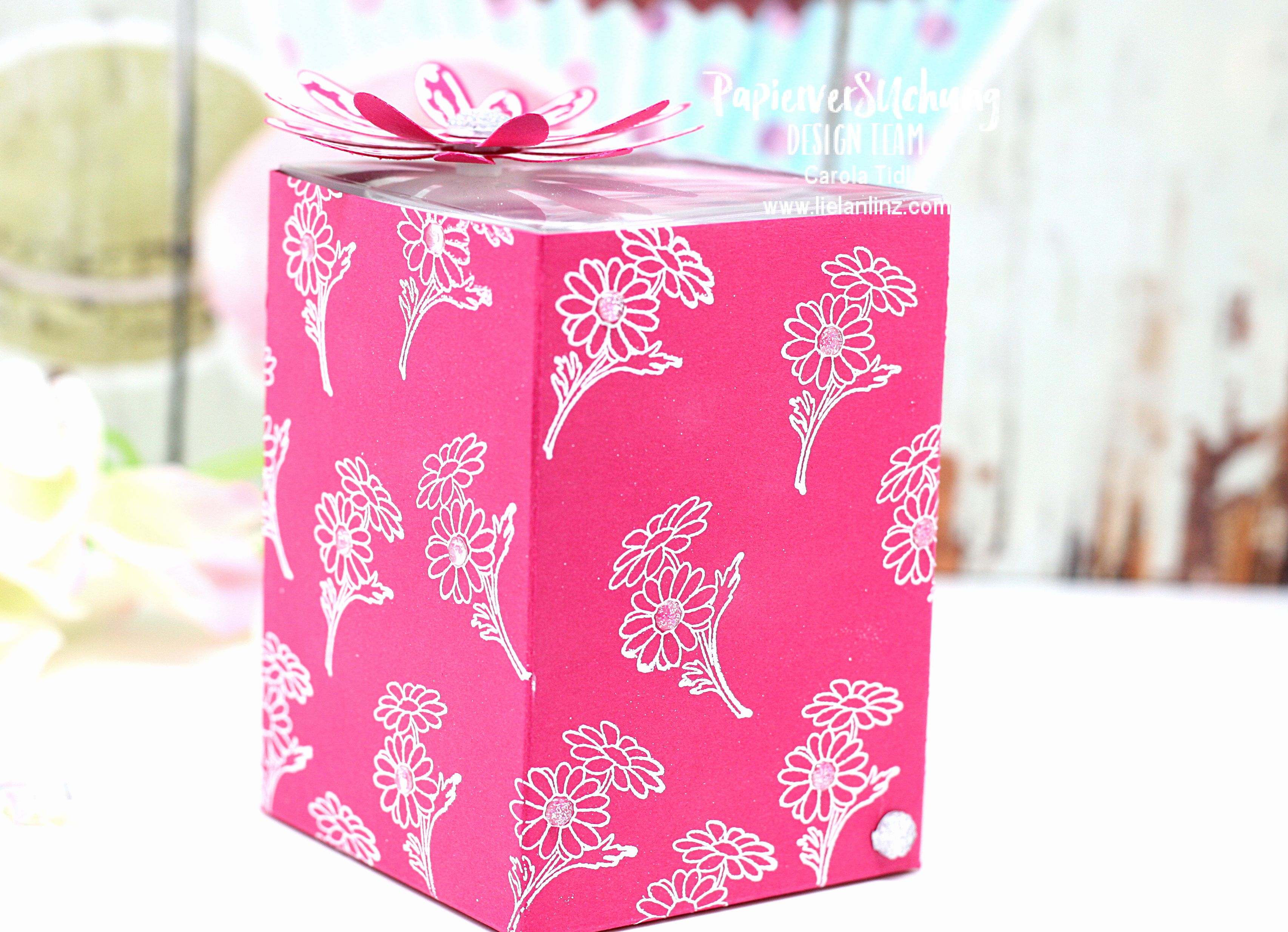 Der Deckel ist in diesem Fall innen liegend und aus Klarsichtfolie erstellt. Dekoriert mit der Blüte aus dem Stempelset Gänseblümchengruß – passend zur embossten Blume.