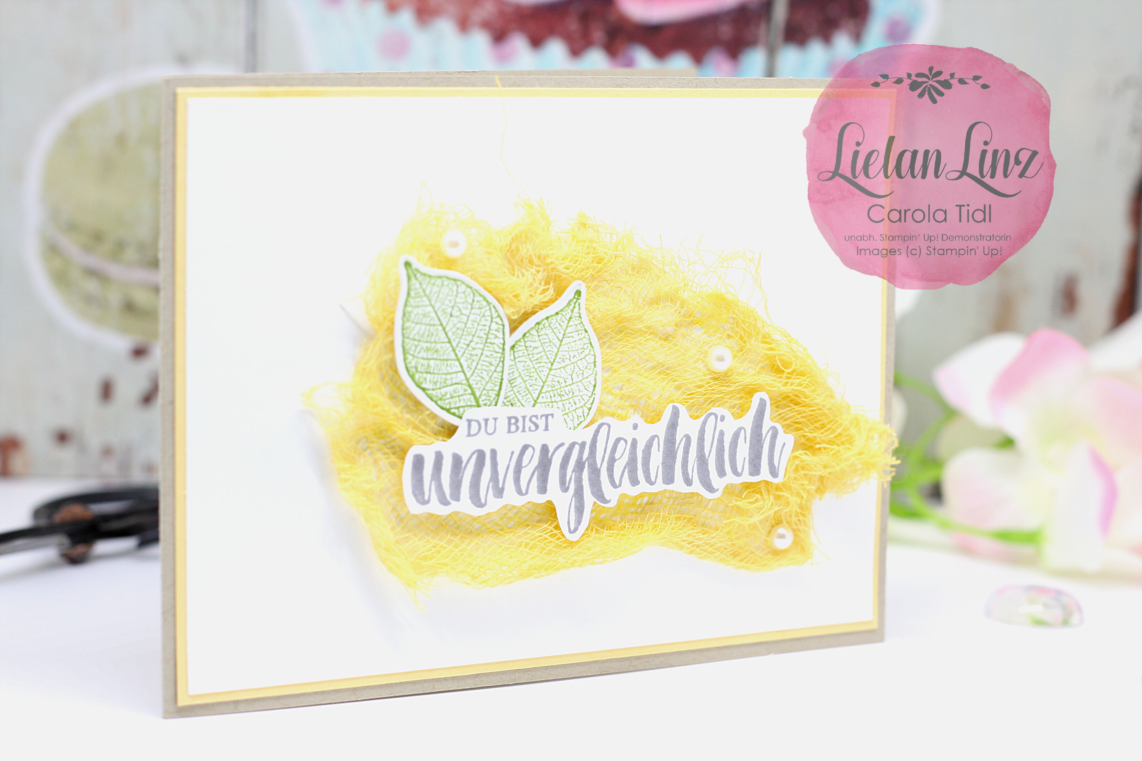 Ich denke mir, dass die Verwendung des eingefärbten Mulltuchs auch toll zur Serie Traum vom Meer passt (Seite 154 und 155 im neuen Jahreskatalog). Hier vielleicht Blautöne verwenden oder wenn Du graue oder braune Nachfülltinte nimmst, dann könnte das Mulltuch z.B. ein Fischernetz darstellen.