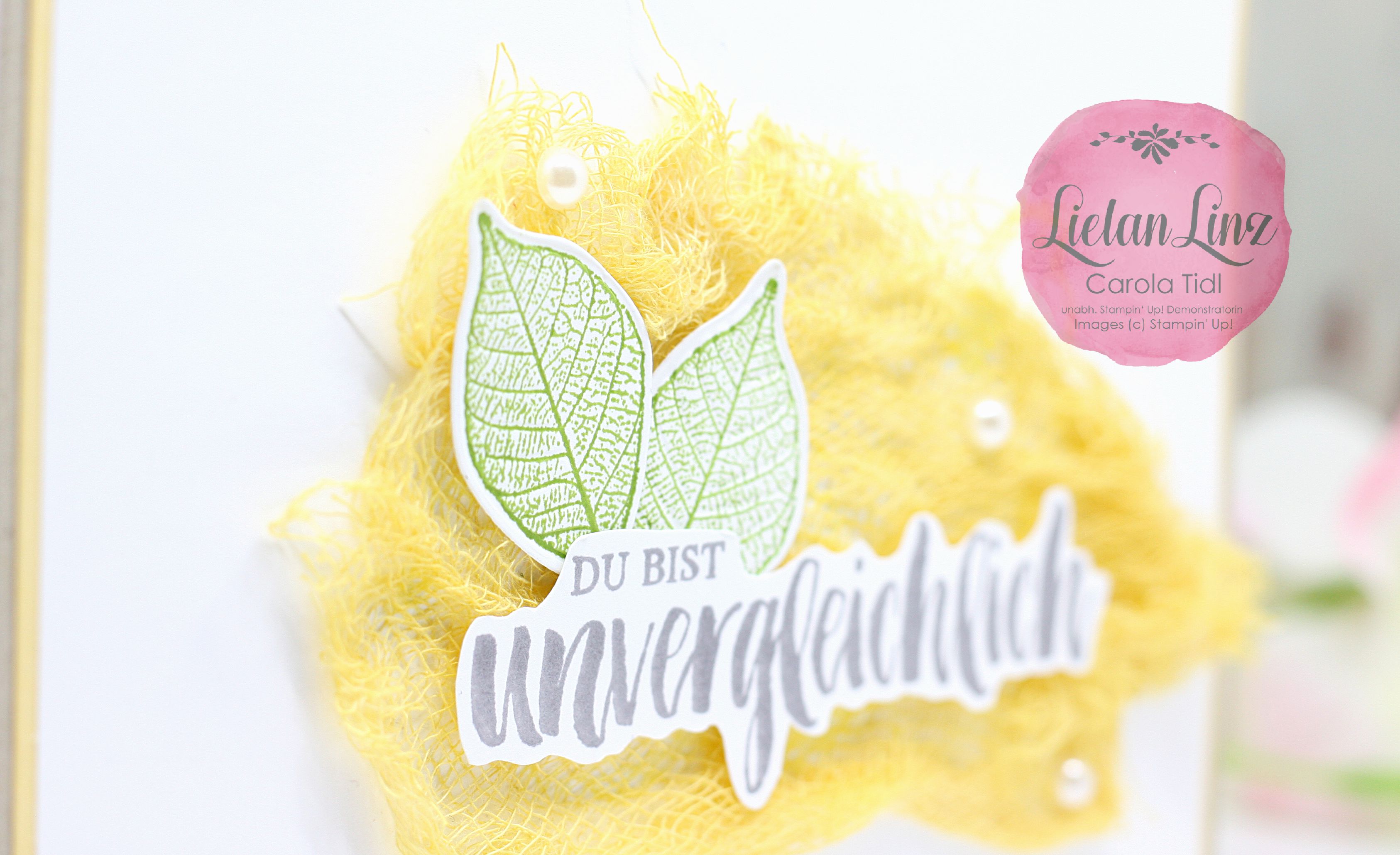 Die Blätter findest Du im gleichen Stempelset. Gestempelt in Grüner Apfel (#147095) auf Flüsterweiß und mit den Framelits (#146341) ausgestanzt.
