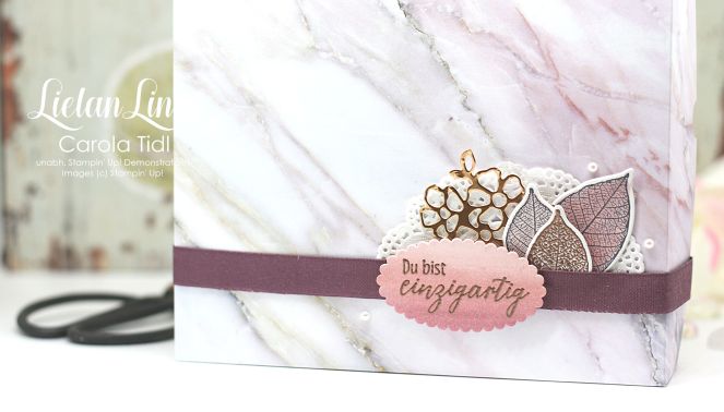 Hier findet man ein Spitzendeckchen in Weiß, Blätter aus dem Stempelset Kraft der Natur (#147604) – zum Teil coloriert mit den Stampin‘ Blends, zum Teil in Kupfer embosst … sowie eine ausgestanzte Form aus dem Set „Framelits Blüten Blätter & Co“ (#145655). Ach ja .. typischerweise dürfen ein paar Perlchen (#144219) nicht fehlen.