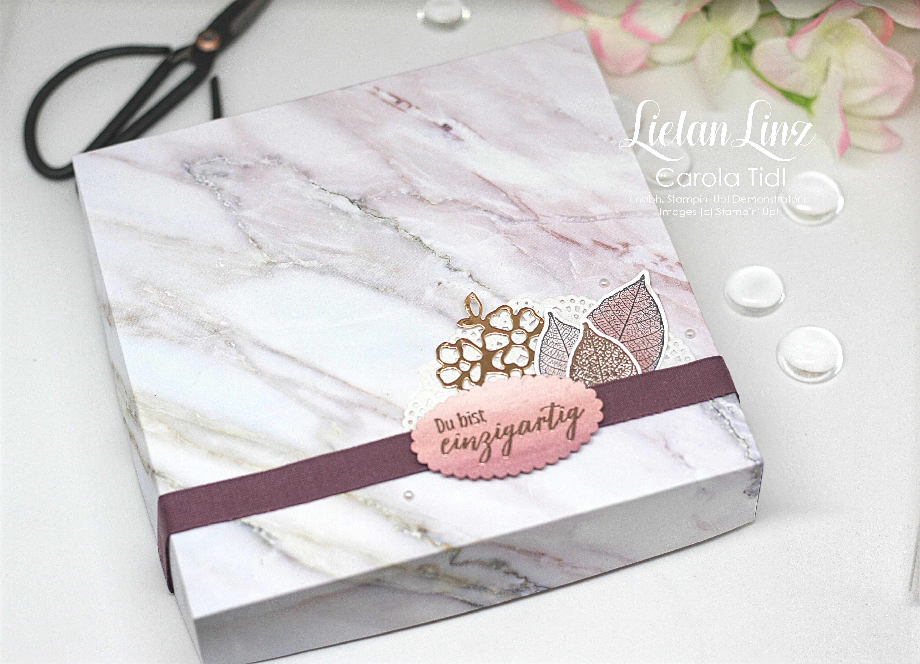Der Boden ist aus Farbkarton in Flüsterweiß (#124302) und der Deckel aus dem Designerpapier Blütenpracht (#146913).