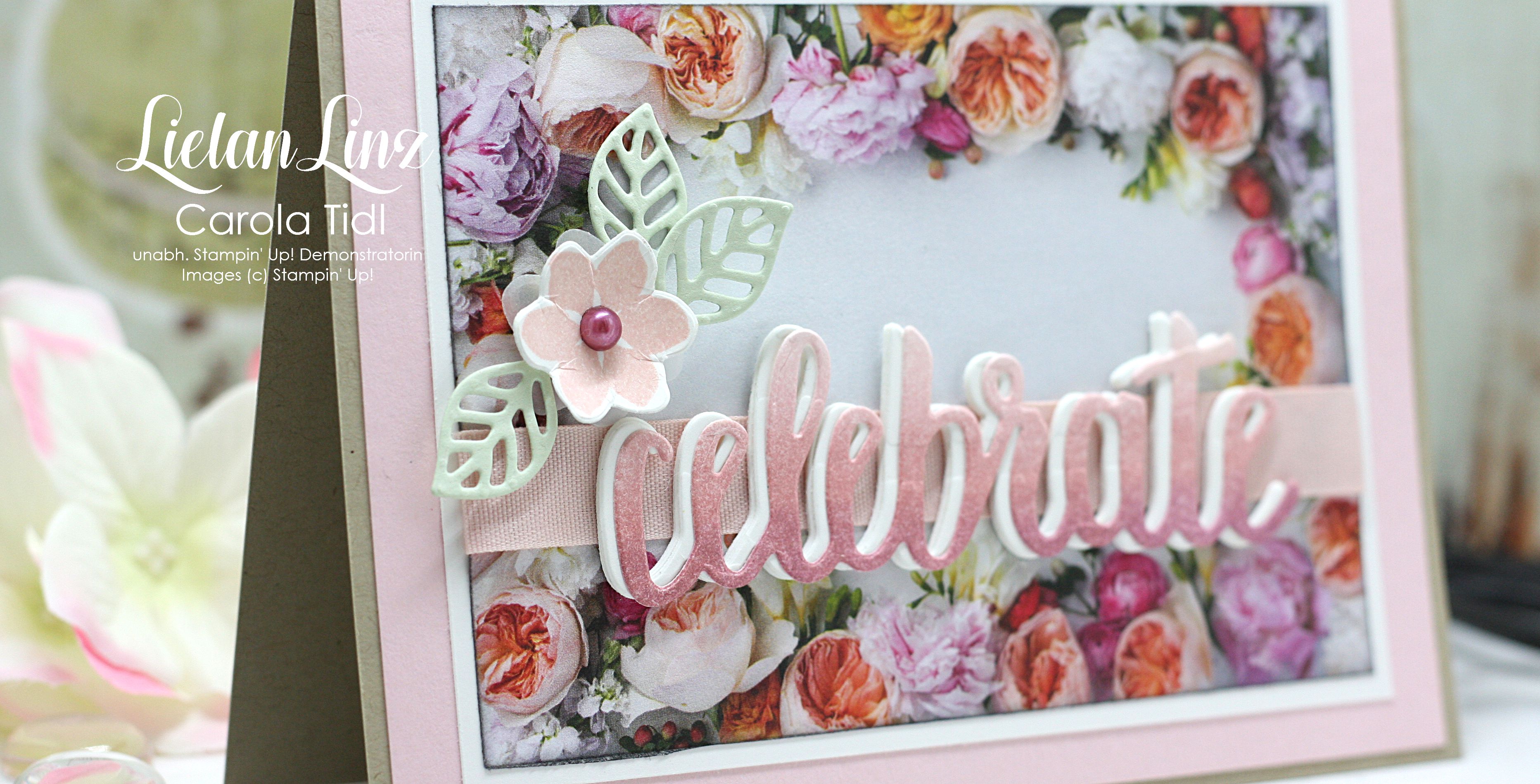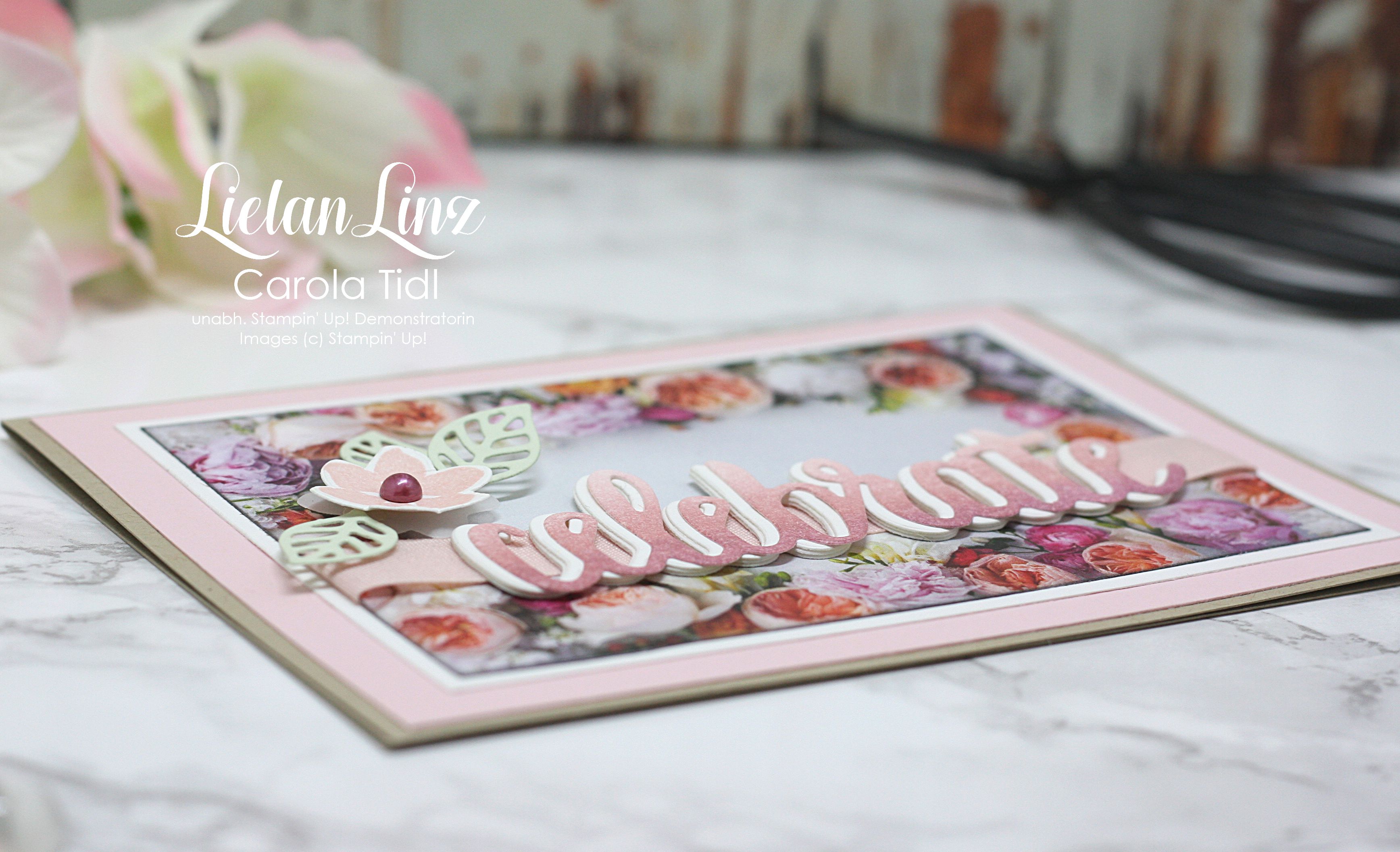 Ich hab’s mir bei dieser Karte ziemlich leicht gemacht und eine der vorgefertigten Kartenteile aus dem Designerpapier Blütenpracht verwendet.