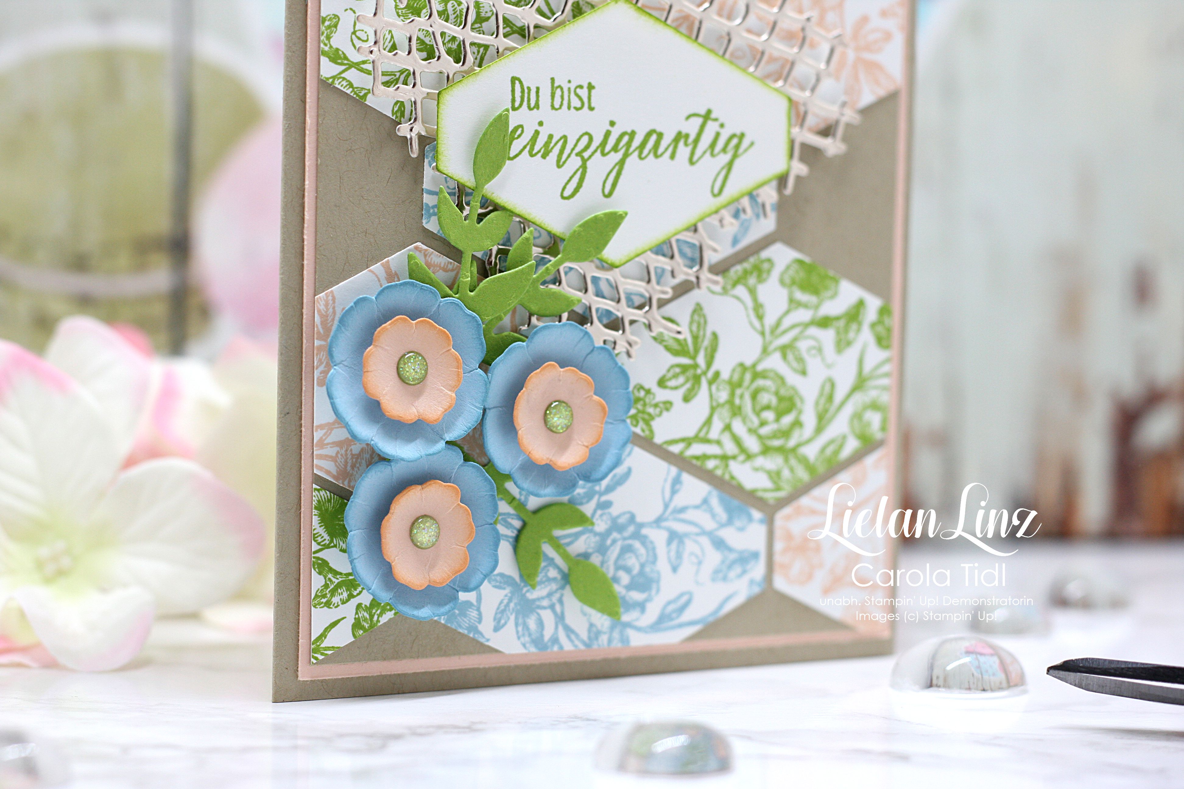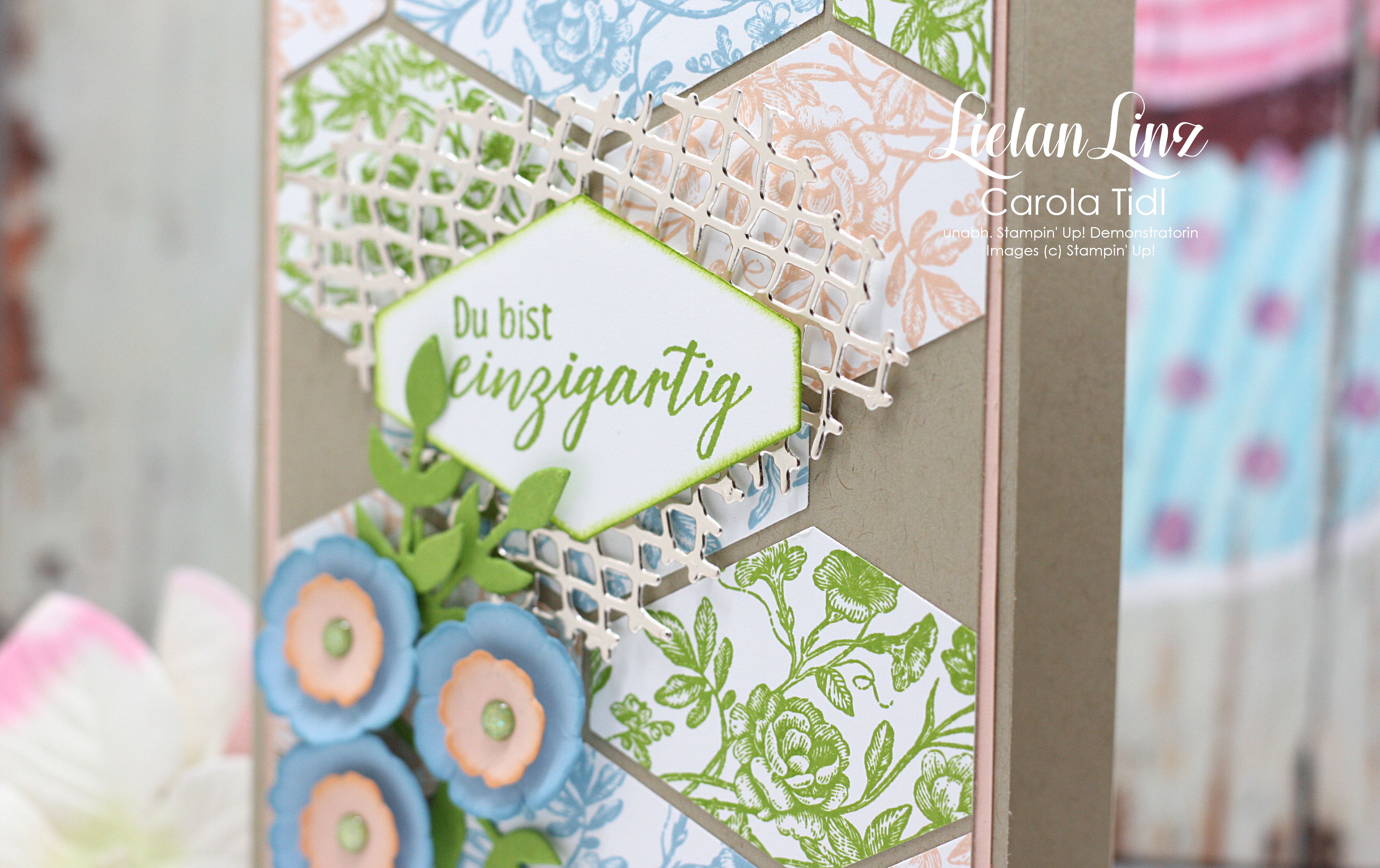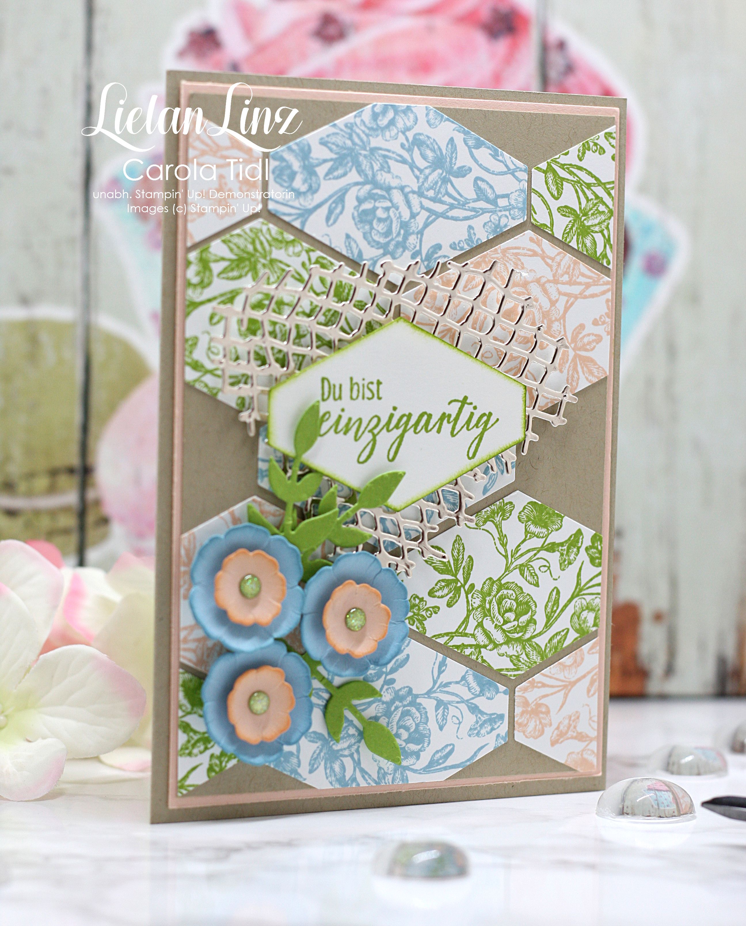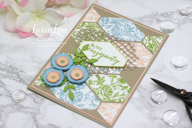 Den Hintergrund habe ich in den drei Farben gestempelt und dazu das Gastgeberinnen-Stempelset Wahrlich Vintage verwendet. Ausgestanzt mit der Stanze Etikett nach Maß.