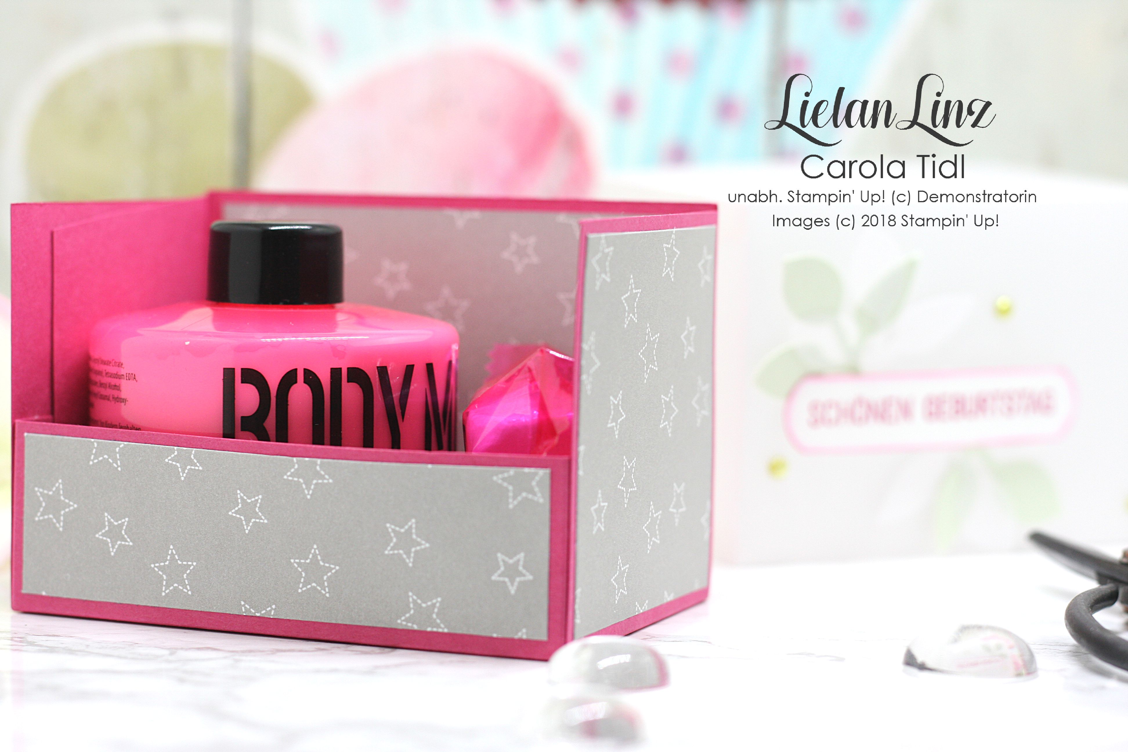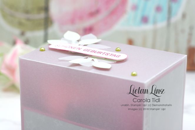 Hier zeige ich Dir, wie Du eine Verpackung erstellen kannst, bei der die Vorderseite nur die Hälfte der Höhe der restlichen Box hat …. bei der dieses Mal der Deckel aus Pergamentpapier ist – welches ich zugegeben, viel zu selten benutze.