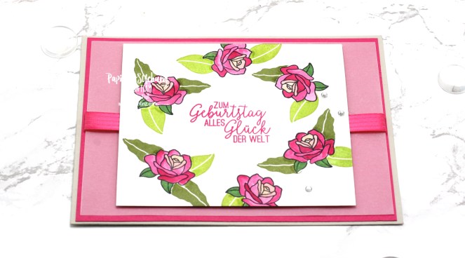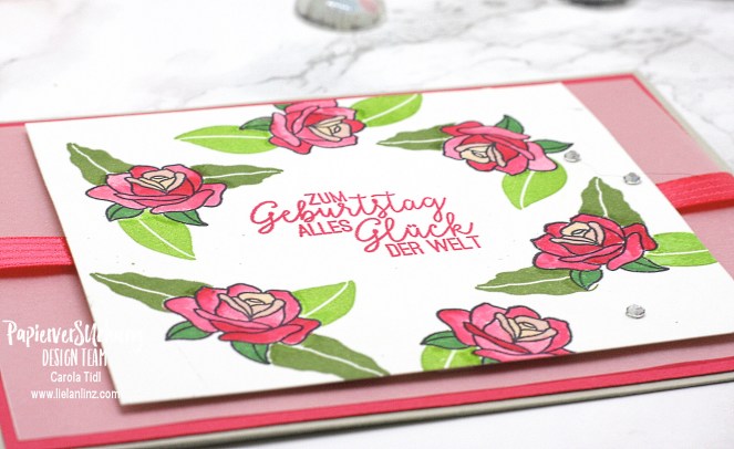 Die Grundkarte ist dieses Mal Farbkarton in Granit, darauf eine Lage in Wassermelone. Dieser Farbton wird dann (neben Kussrot) auch noch bei den Blüten verwendet.