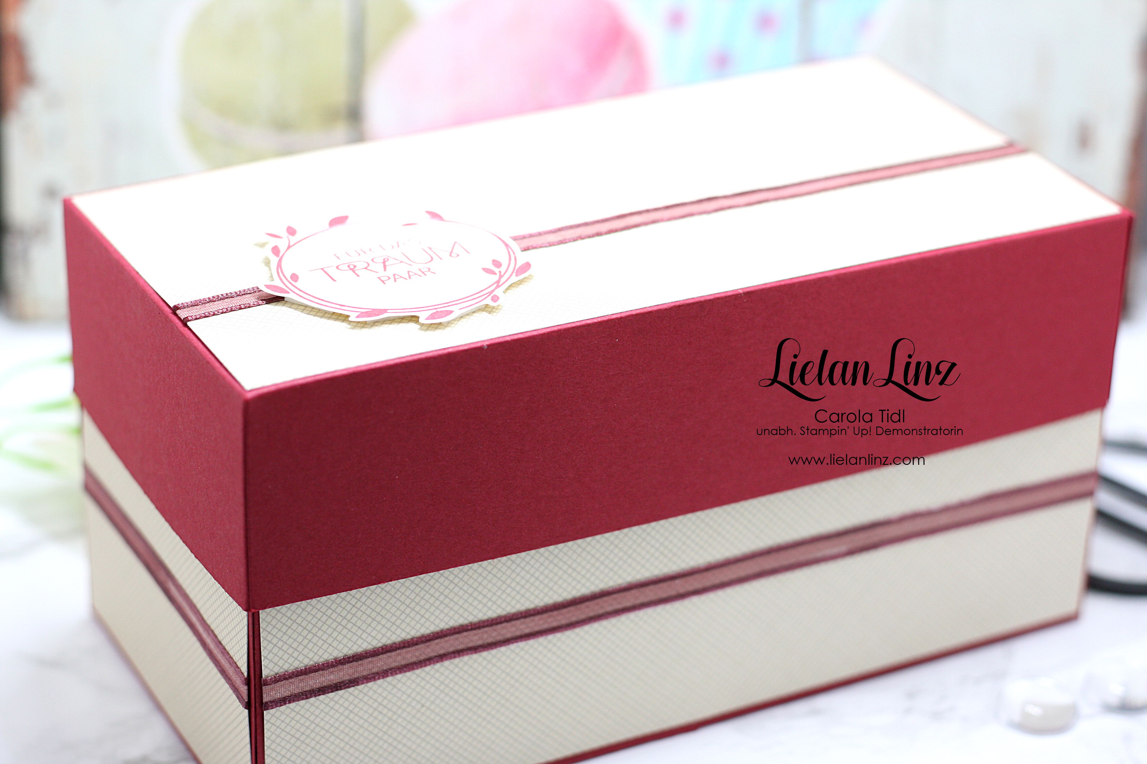 Nachdem die Einladung in Rot / Vanille gehalten war, habe ich die Box dem Farbschema des Brautpaares angepasst.