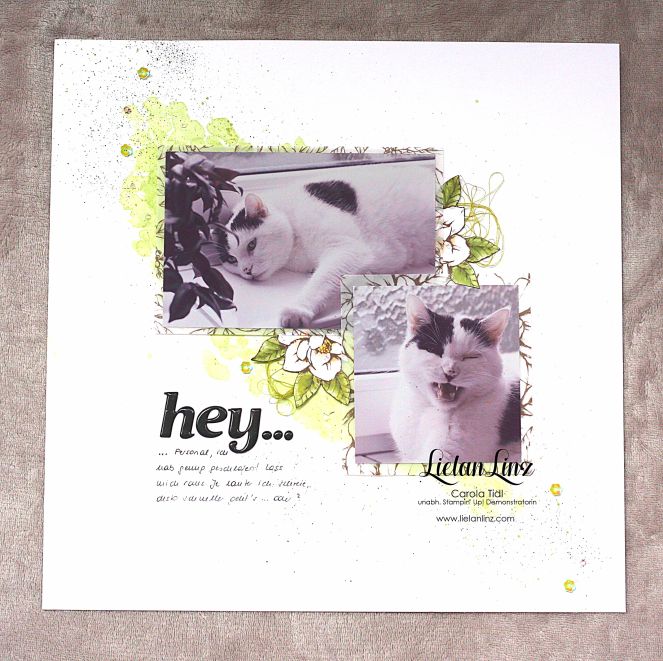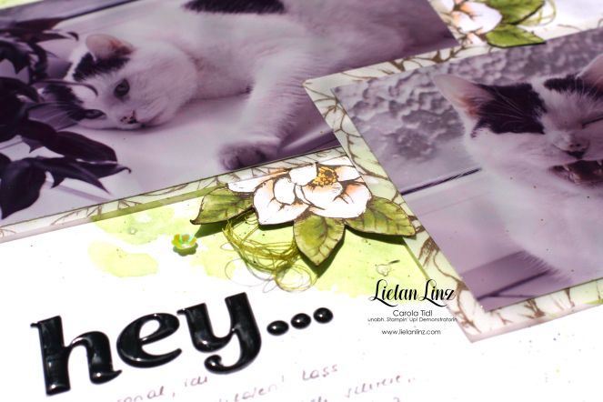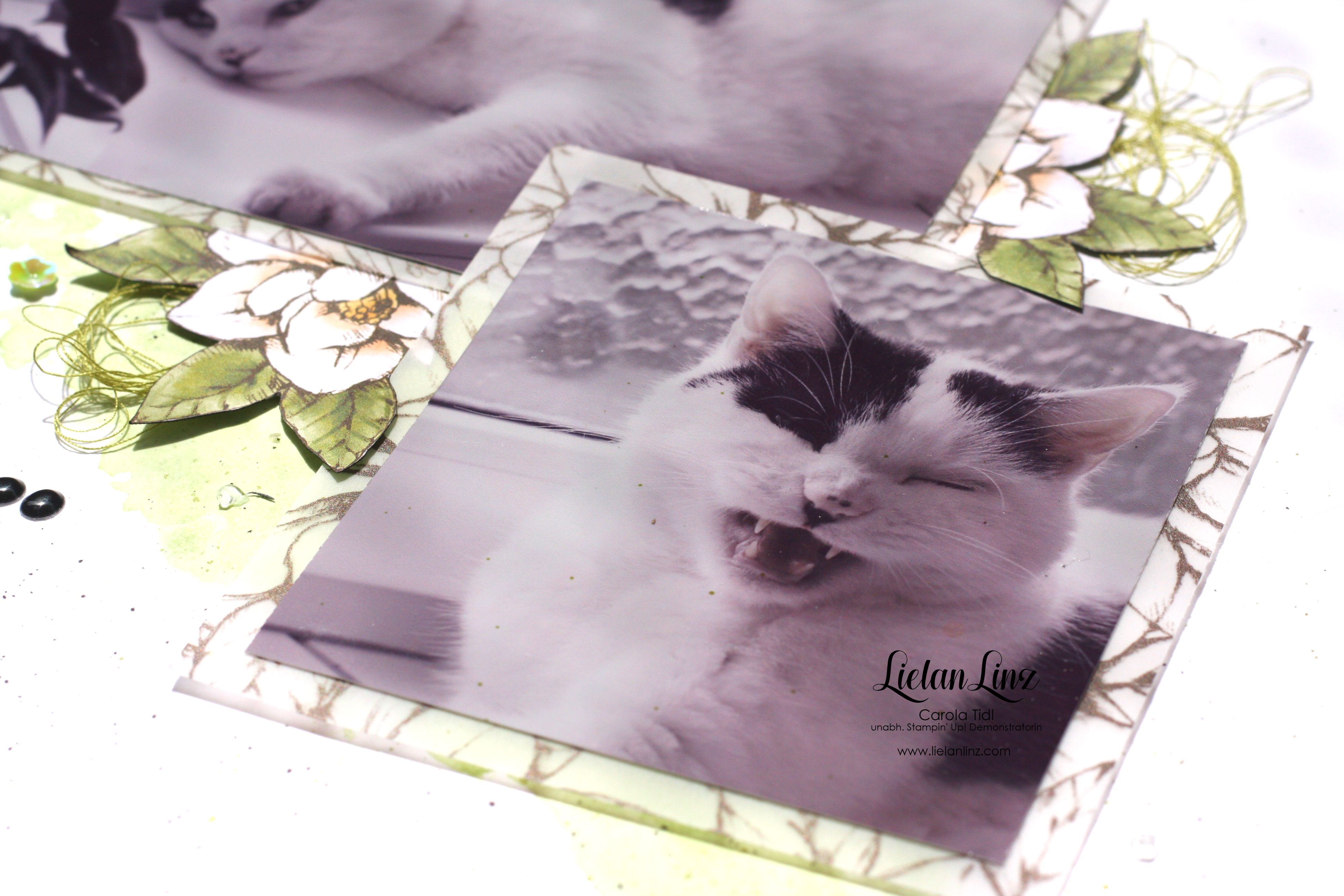 Ich hab mir zwei Bilder von meinem Kater gescrappt, der mich doch sehr gerne schimpft, wenn ich ihn nicht aus der Wohnung lasse *gg* Verwendet habe ich Teile aus dem Kartensortiment „Magnolienweg“ und habe einige der Blüten mit der Hand ausgeschnitten.