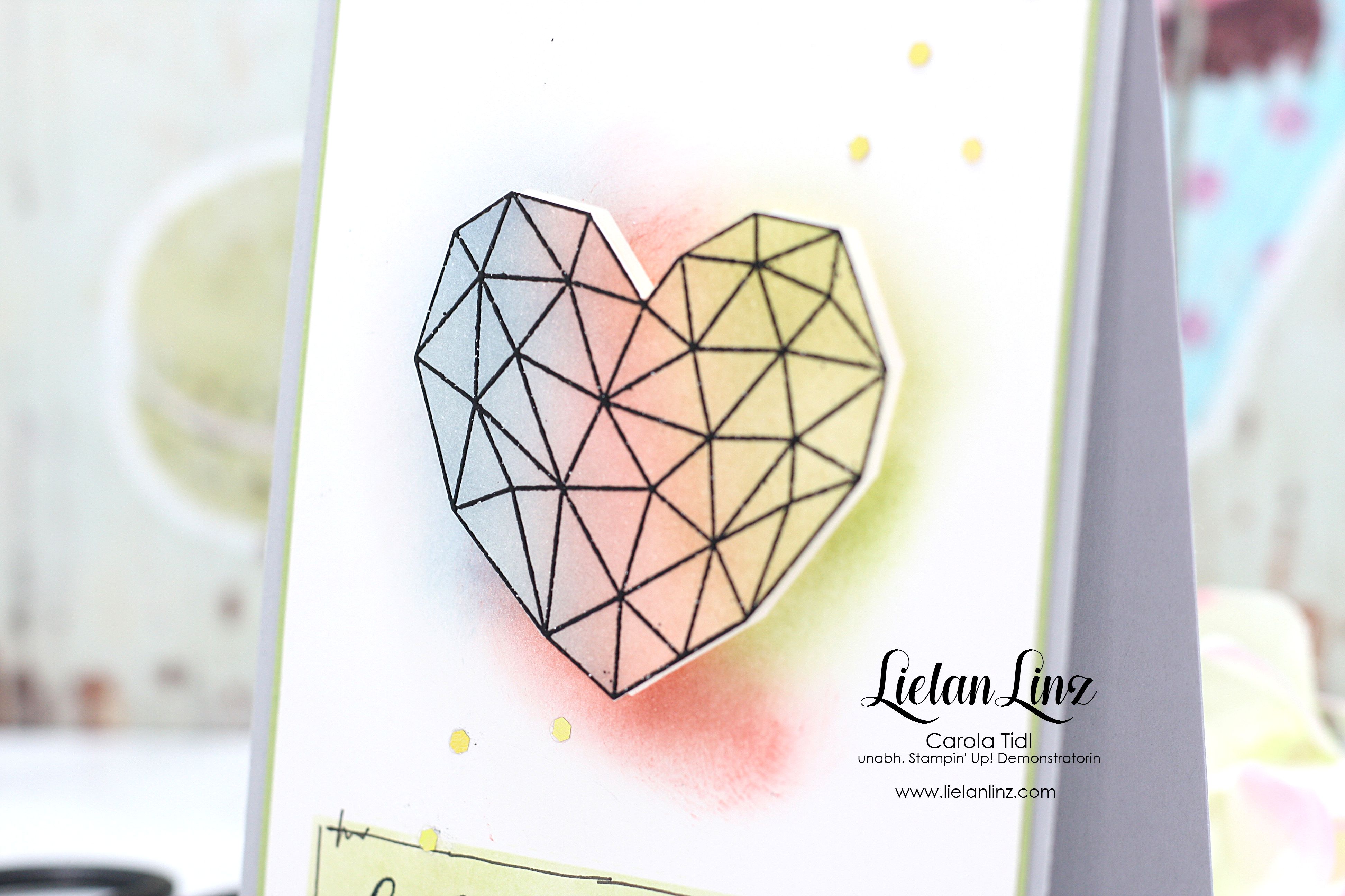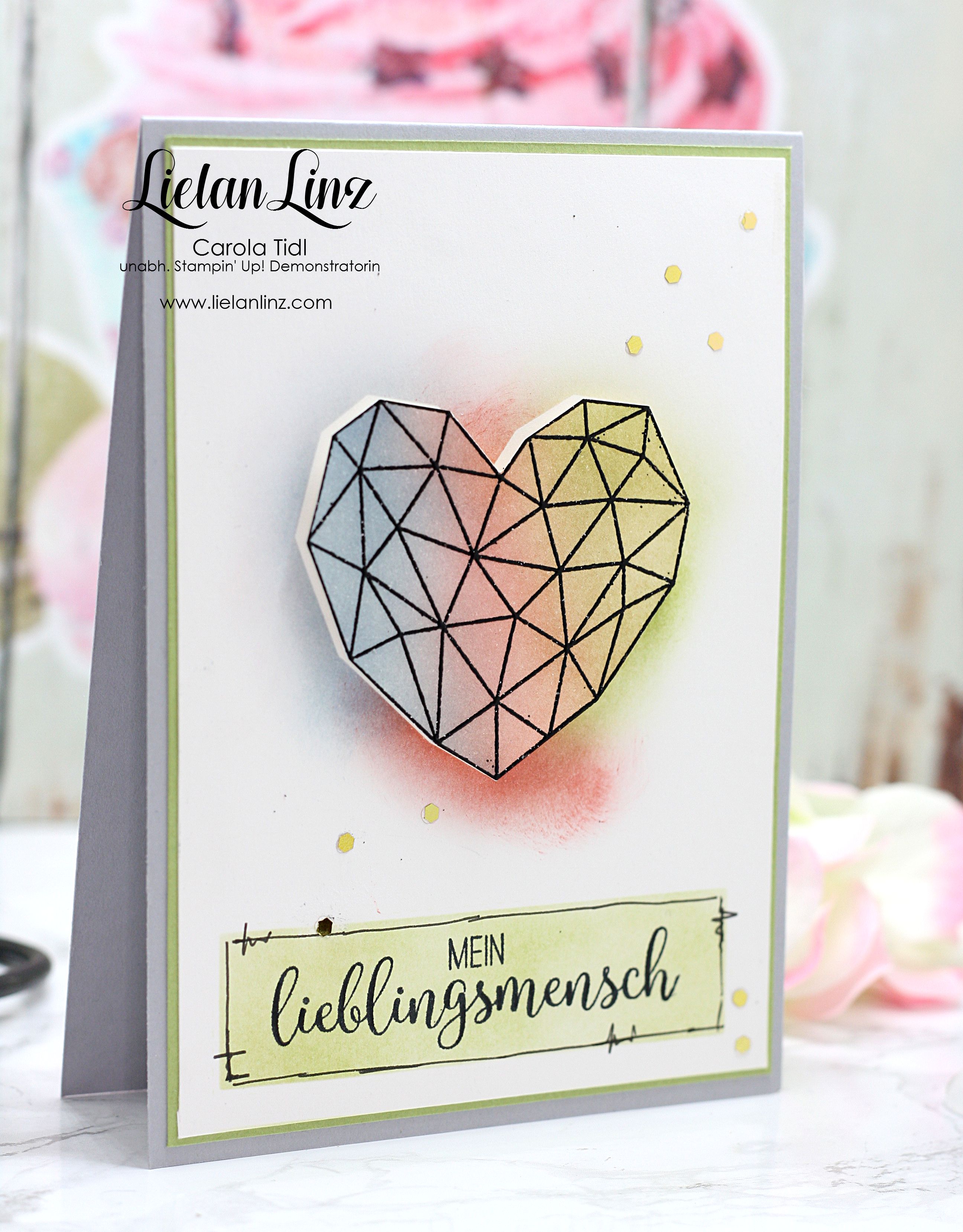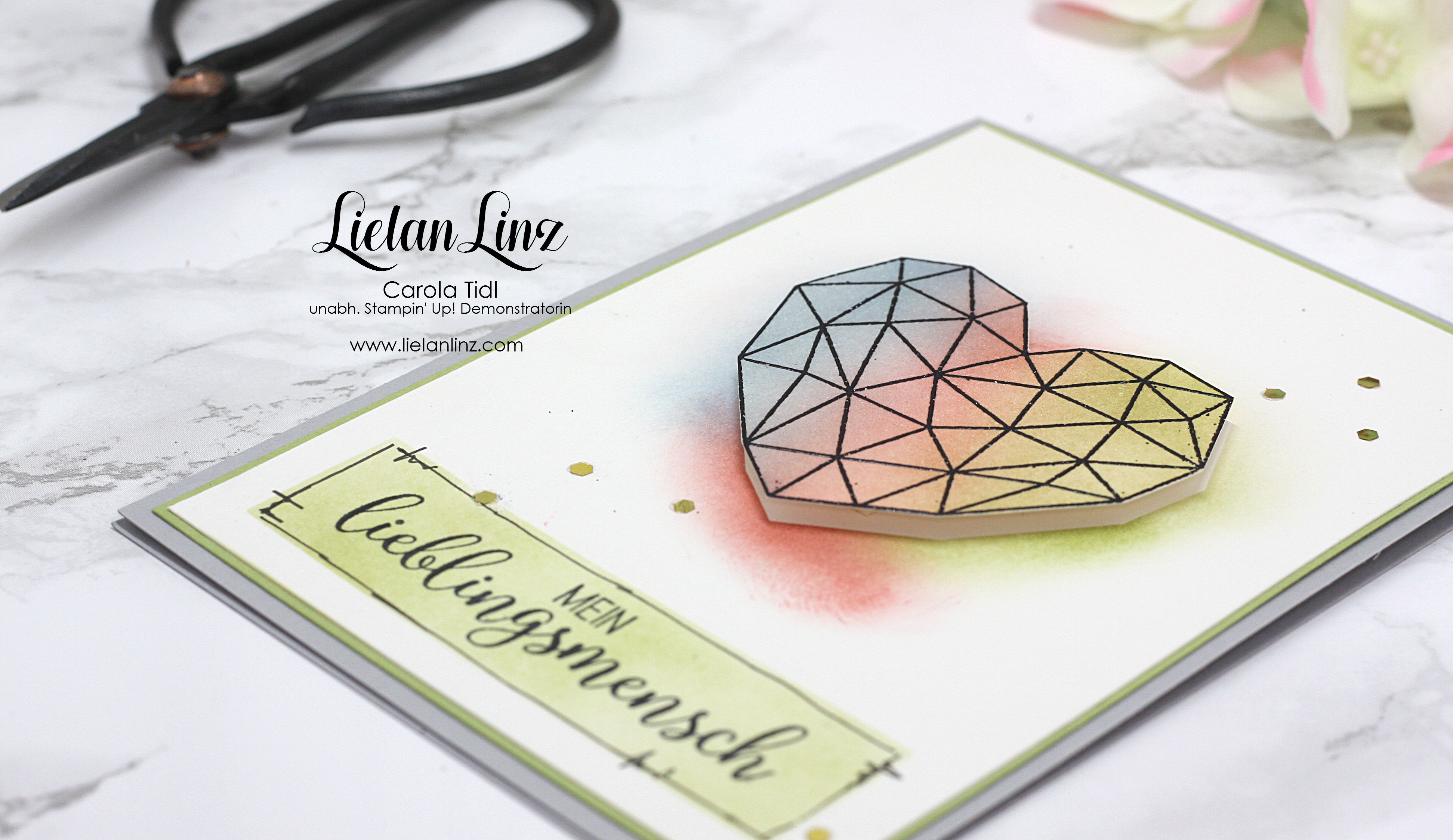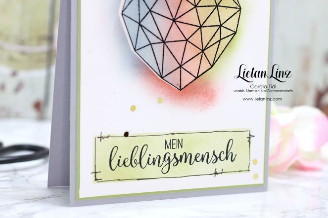 Ihr wisst ja, dass ich Karten clean and simple, also ohne viel Schnickschnack mag … daher steht hier im Mittelpunkt das Herz aus dem Stempelset „Kunst mit Herz“.