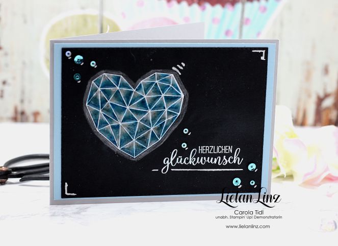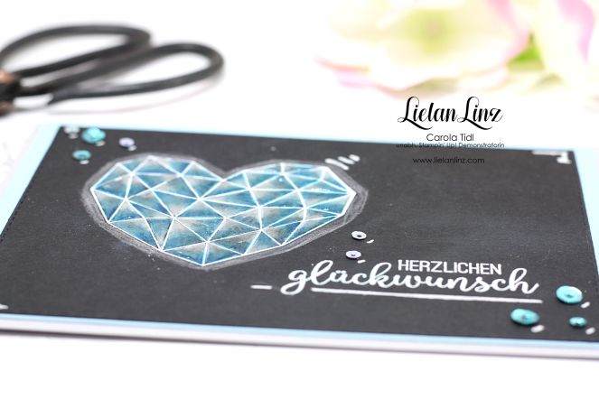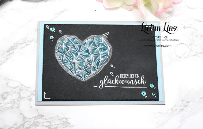 Das Herz in weiß embosst, genauso wie der Spruch. Die Pailletten findet ihr im Sortimen Vintage Flair .. aber wie immer habe ich euch am Ende dieses Blogbeitrages alle verwendeten Materialien aufgelistet.