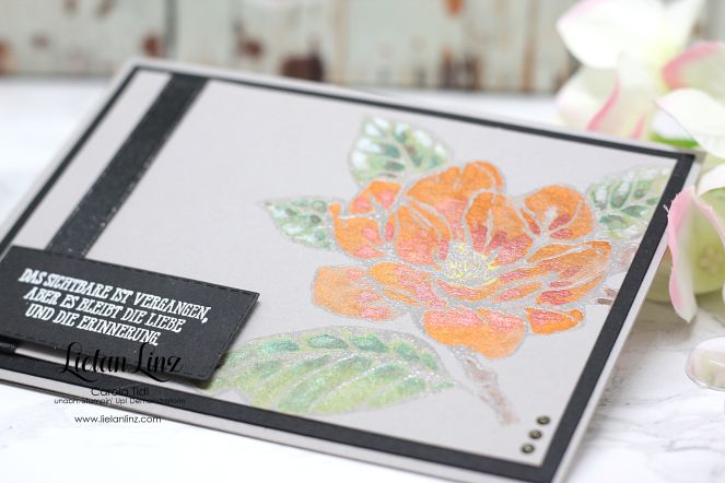 Die Magnolie habe ich mit Schimmerwasserfarben der Marke FineTec koloriert, nachdem ich die Blüte in Klar auf Granit embosst hatte.