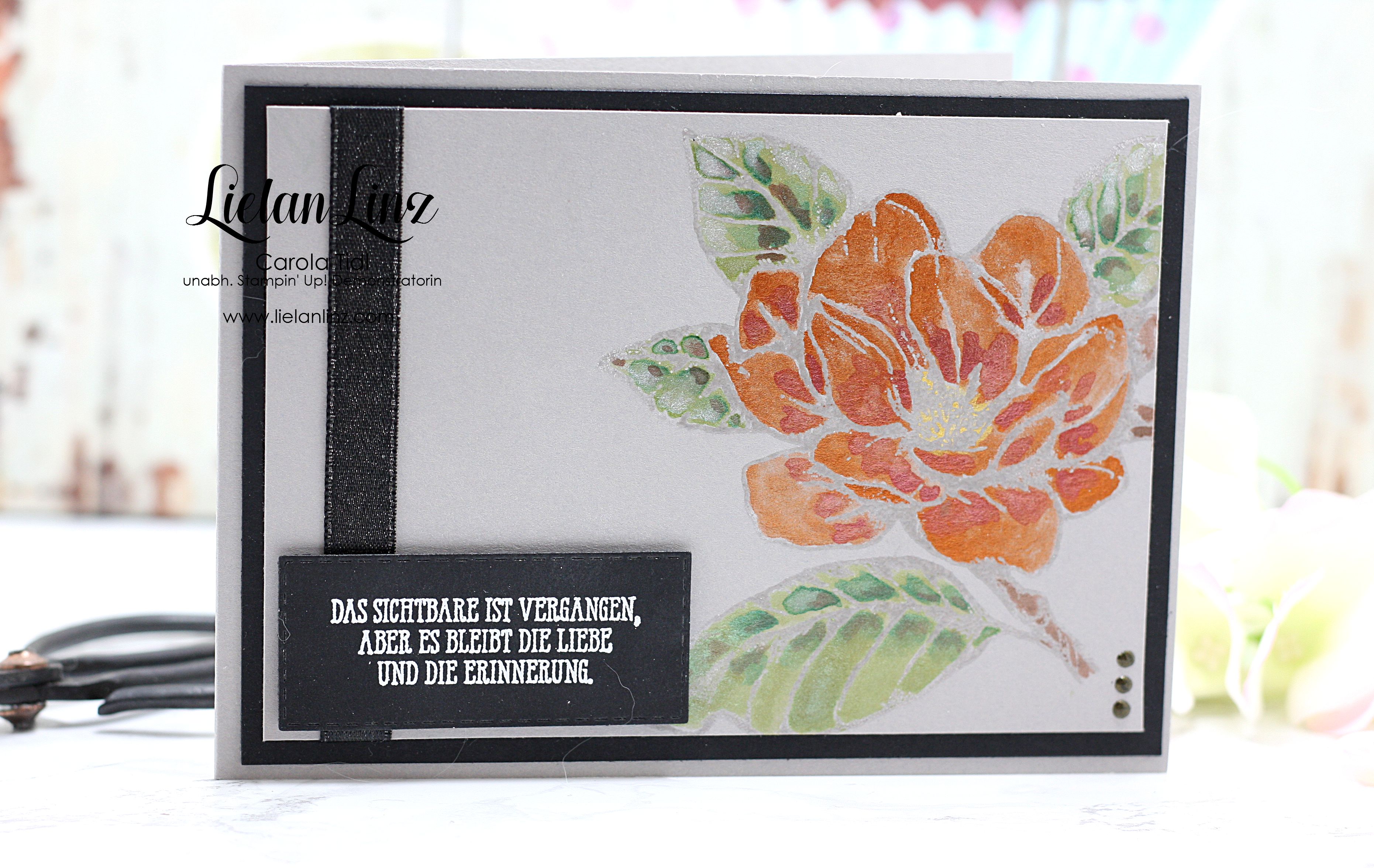 Durch den durchsichtigen Kontrast, die (für eine Geburtstagskarte) falsch gewählten Farben und den grauen Hintergrund, war das von Anfang an keine fröhliche Karte. Daher habe ich mich entschieden, eine Trauerkarte daraus zu machen. In der Hofffnung, diese noch lange nicht zu benötigen <3