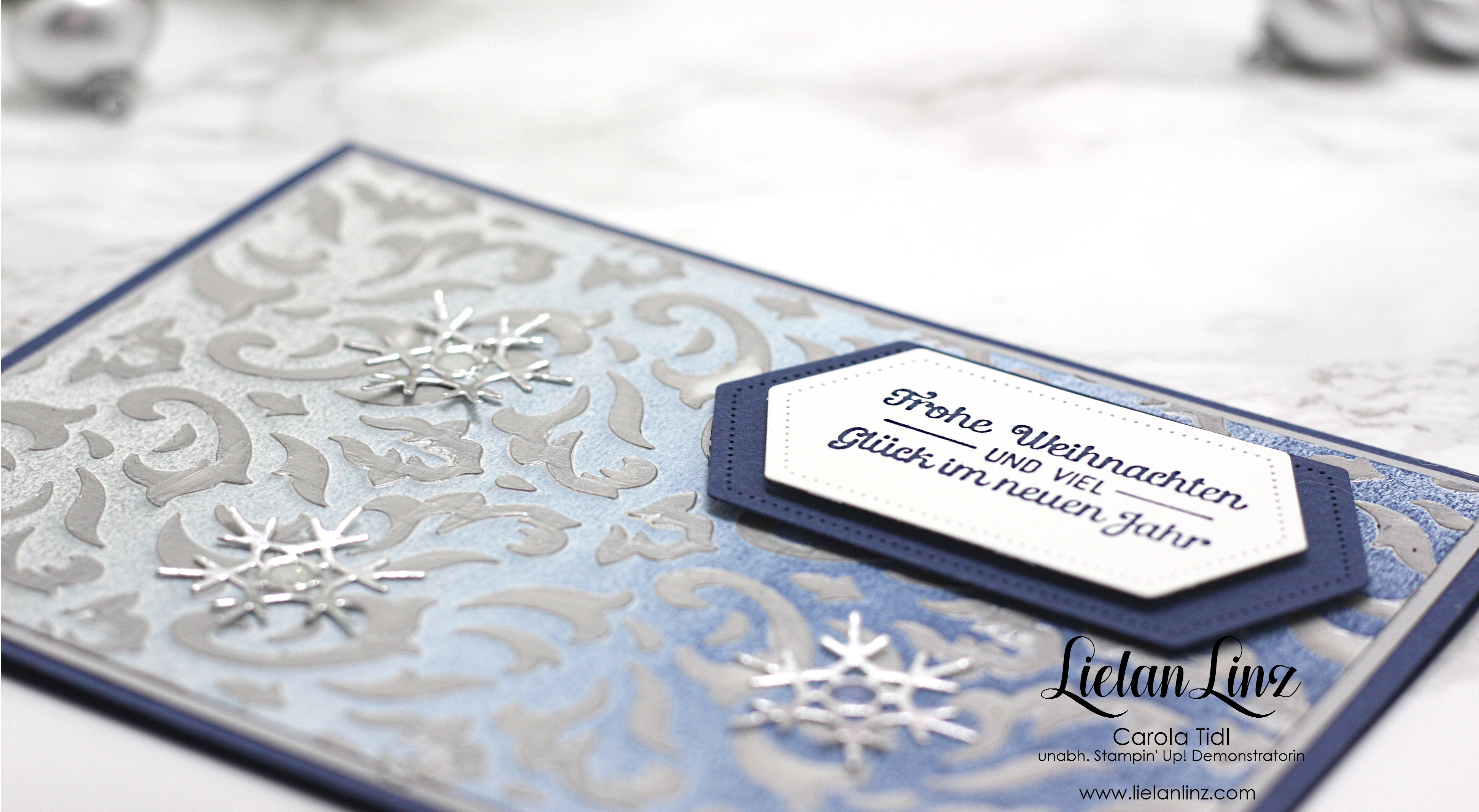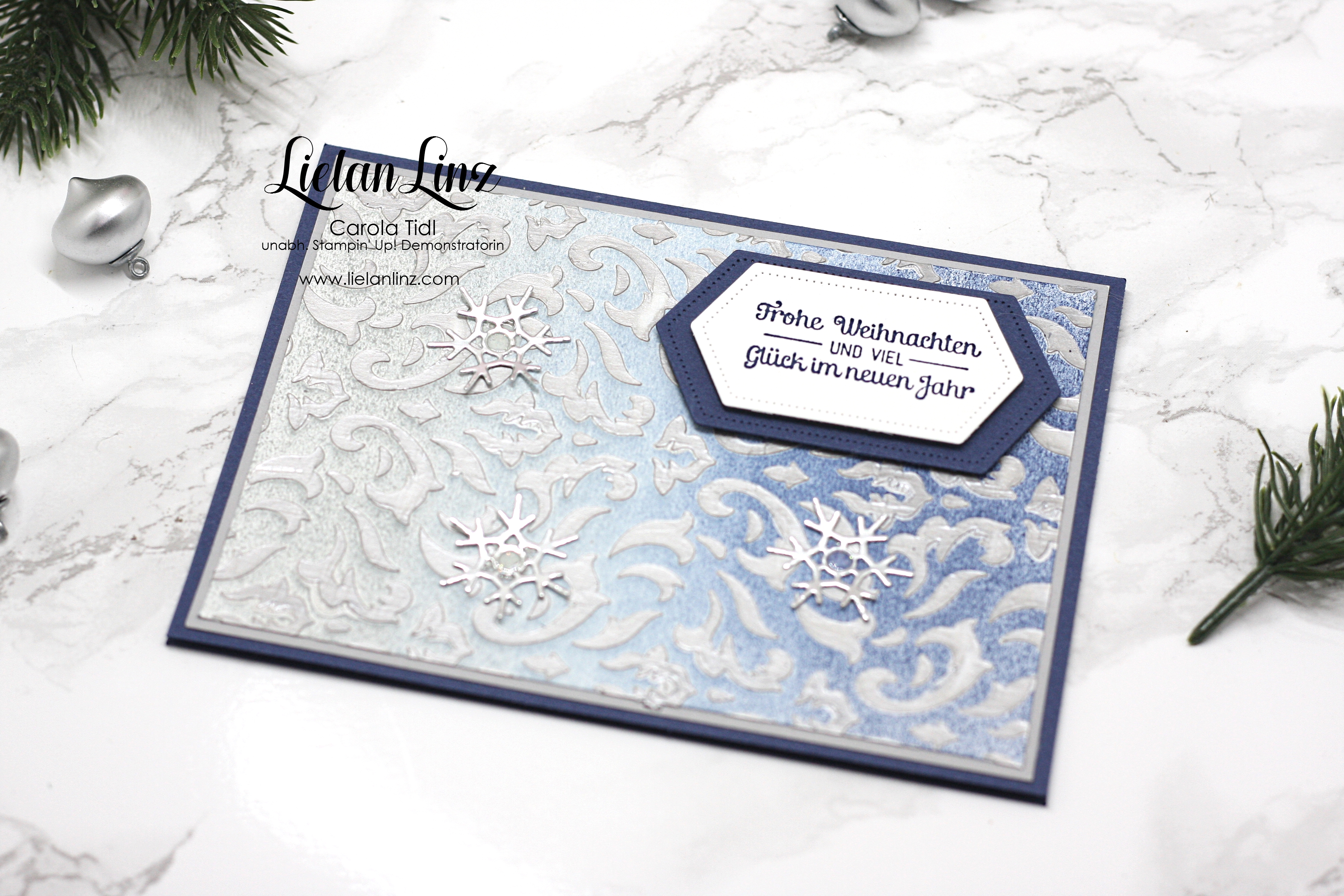 Ich wollte euch unbedingt die neuen Dekoschablonen zeigen! Leider habe ich keine weiße Strukturpaste mehr zu Hause, daher hab ich spontan zur silbernen gegriffen. Der Ombré-Effekt geht von Schiefergrau über Rauchblau zu Marineblau. Kühle winterliche Farben, daher nicht ganz so weihnachtlich, aber für einen Glückwunsch zu neuen Jahr allemal passend.