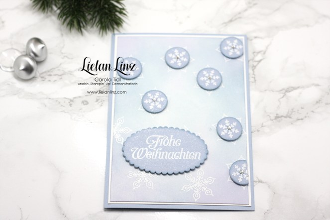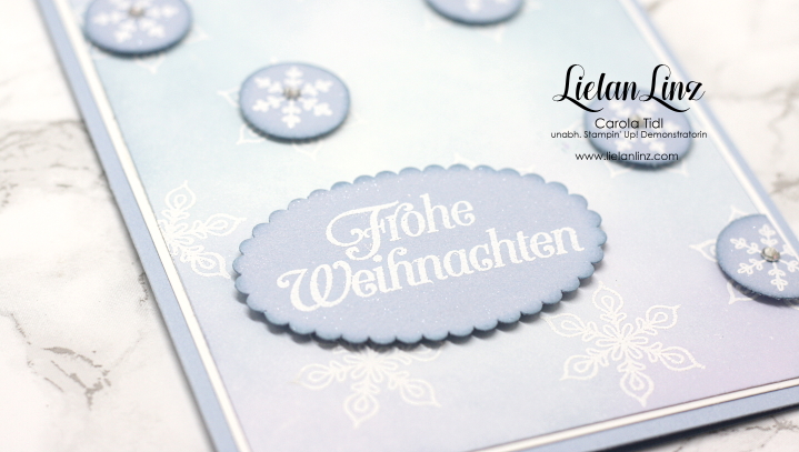 Schneeflocken in weiß embosst und mit Dimensionals aufgeklebt und dabei immer den Rand in Rauchblau eingefärbt.