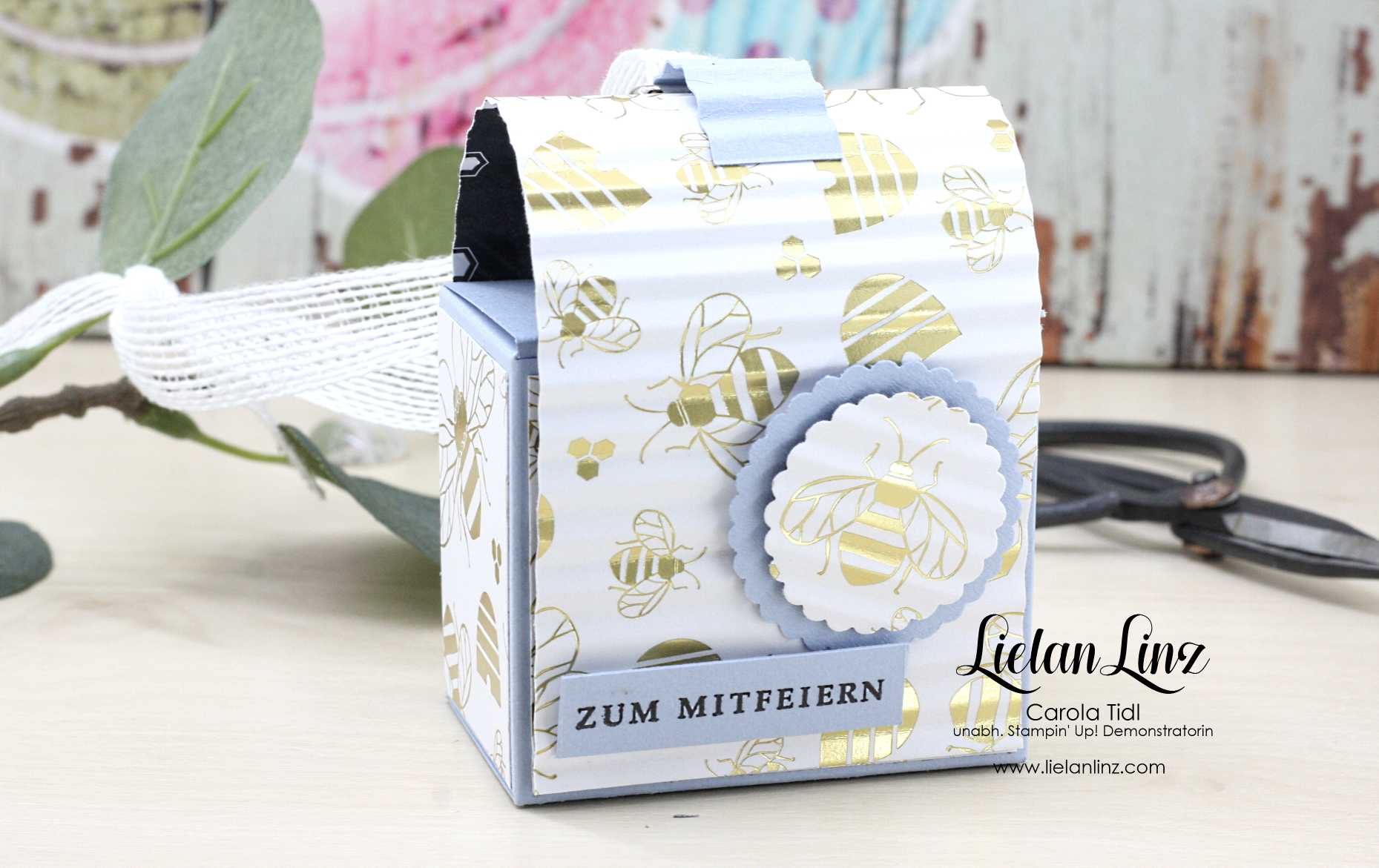 Die Bilder seht ihr mit Farbkarton Rauchblau und dem Designerpapier Bienengold. Im Video werkeln wir eine Versmit Farbkarton Ananas und dem Designerpapier Blütenglanz. Beide Designerpapiere könnt ihr euch noch bis 31.3. als 60 EUR – Sale a bration Geschenk sichern.