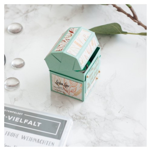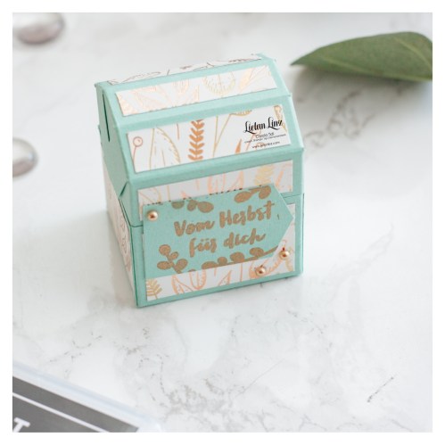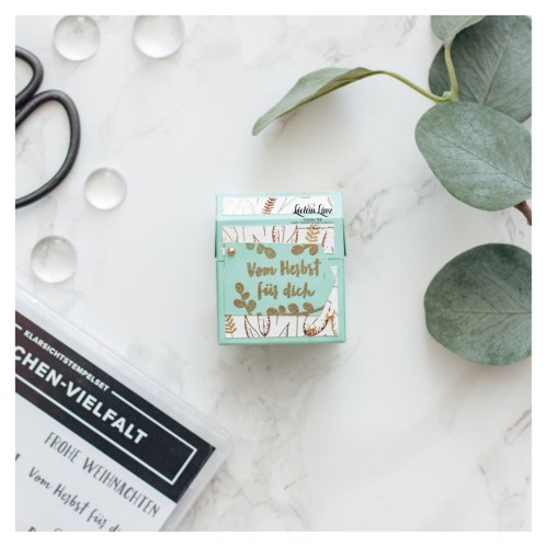 Ich habe mich hier für Farbkarton in Minzmakrone (#138344) und das neue Designerpapier Goldener Herbst (#153520) entschieden. Den Spruch und die Deko in Gold embosst, weil’s so gut zum Papier passt.