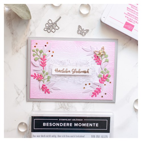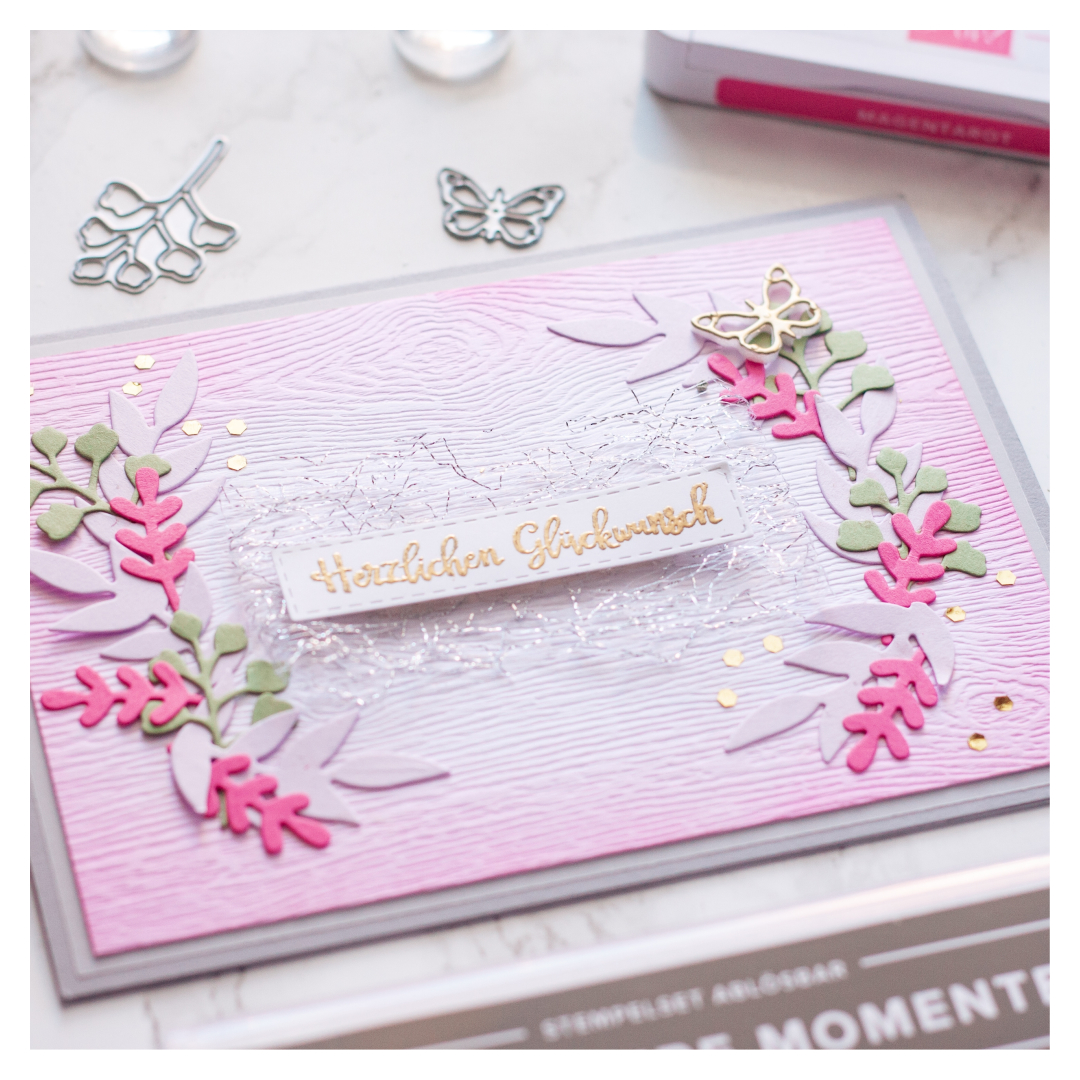 Im 1. Schritt habe ich den Rand vom strukturierten Farbkarton (9.5 x 13.5 cm) in der Farbe Magentarot eingefärbt. Dann habe ich aus den Stanzformen Ewige Zweige und Gedanken der Natur die Blätter in den Farben Flieder, Magentarot und Farngrün ausgestanzt und als Bordüre aufgeklebt.